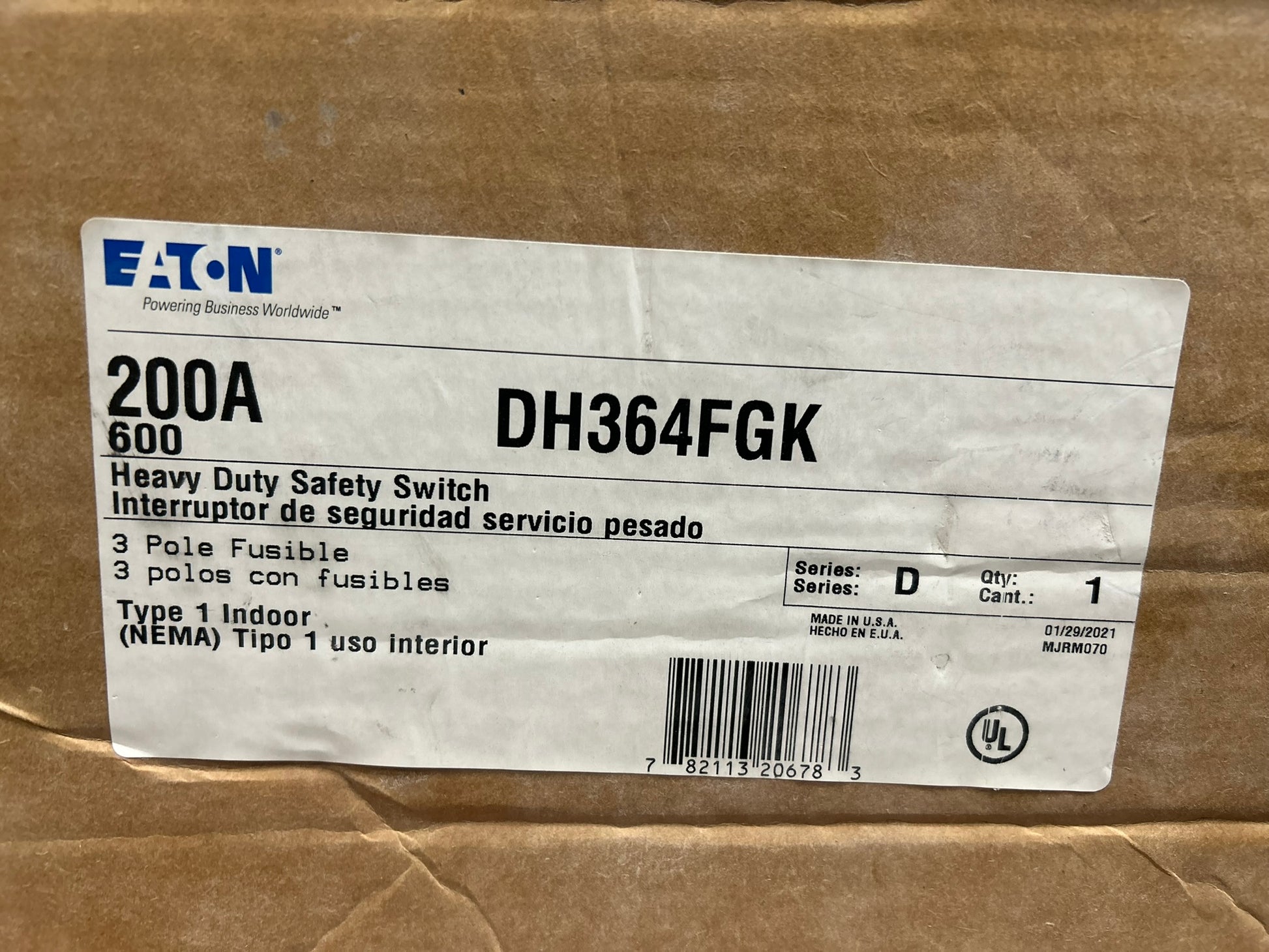 The Eaton DH364FGK is a 200A, 3-phase fusible safety switch designed for 600VAC applications, offering reliable electrical protection in a NEMA 1 indoor-rated enclosure. Built for high-performance with a 200kA AIC rating, this switch is ideal for securing and isolating circuits in industrial and commercial settings. It provides both safety and durability, ensuring fault protection and efficient operation in demanding environments. With its fusible design, the DH364FGK ensures maximum safety while maintaining easy control over your electrical systems.