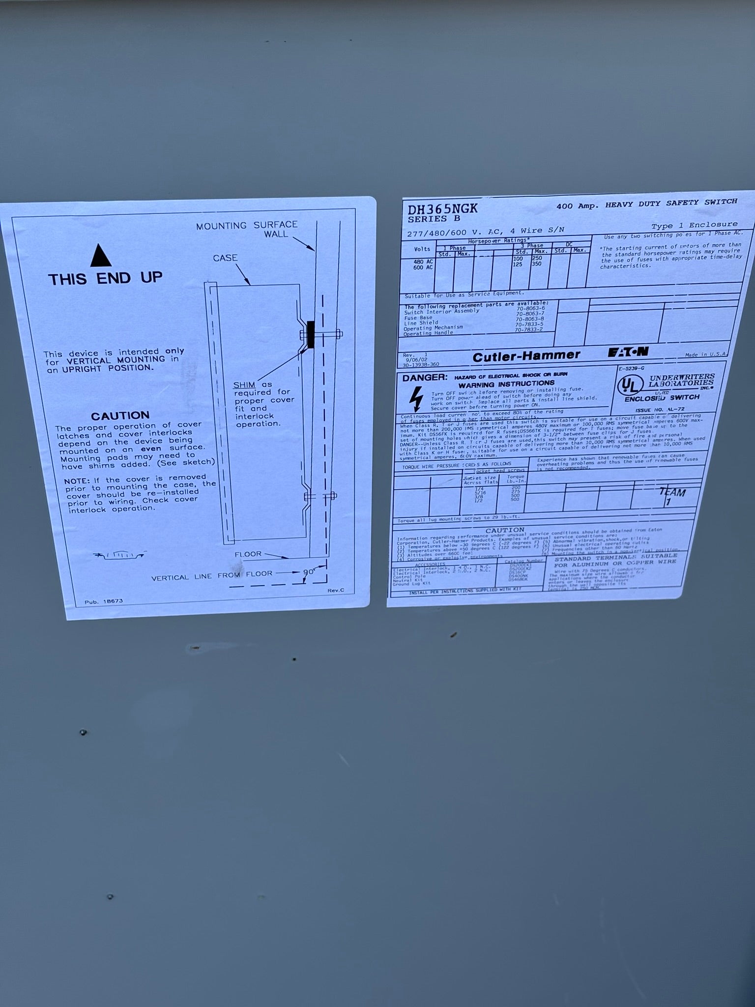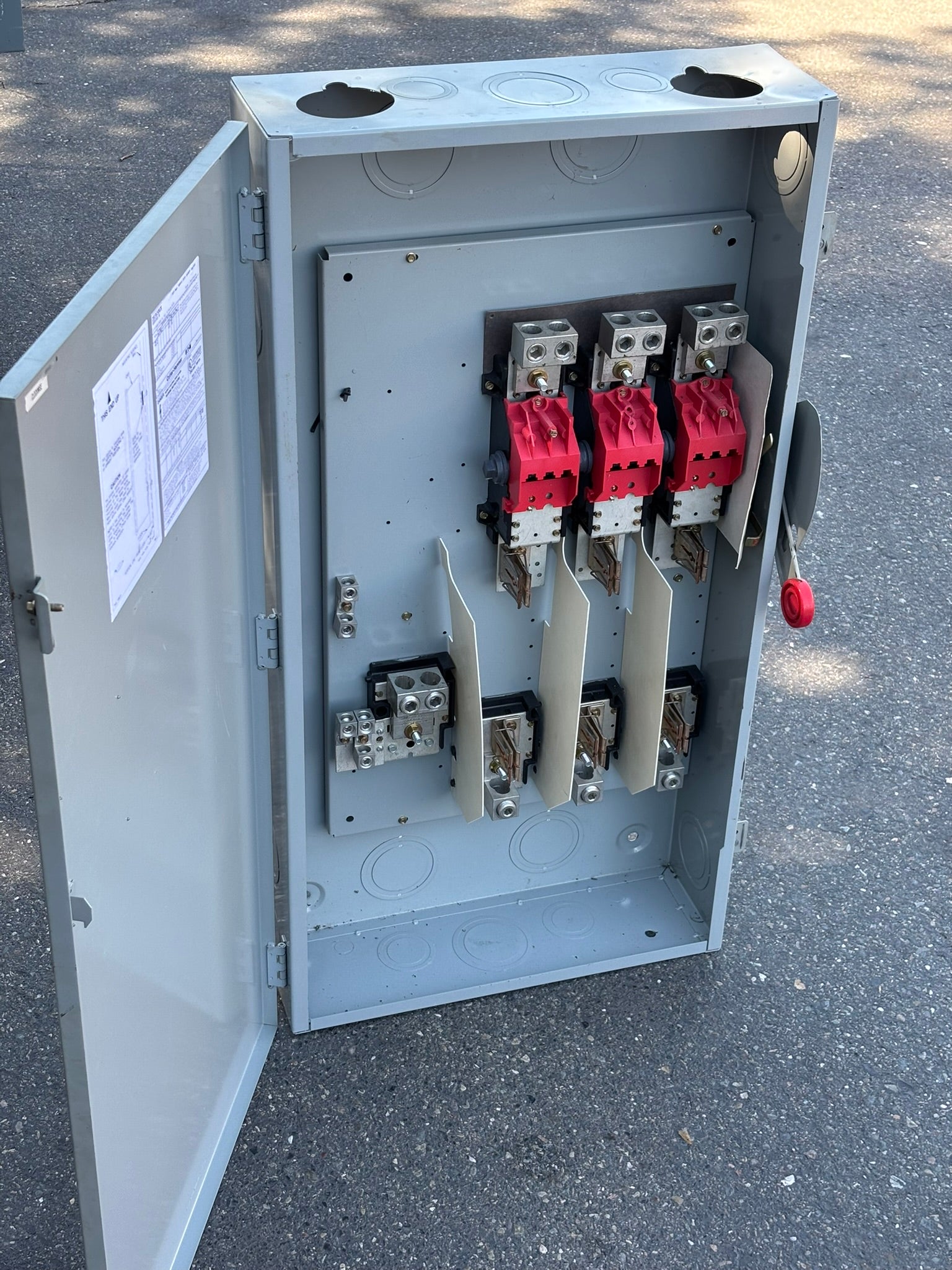 The Eaton Heavy Duty Single-Throw Fused Safety Switch is a 400 A, three-pole, four-wire device rated for up to 600 V and housed in a NEMA 1 painted steel enclosure. Designed for Class H fusible applications with a neutral, it supports maximum horsepower ratings of 250 HP and 350 HP for 3-phase systems at 480/600 V. The switch accommodates conductor ranges of (2)#1/0–(2)300 kcmil or (1)#1/0–(1)750 kcmil aluminum.
