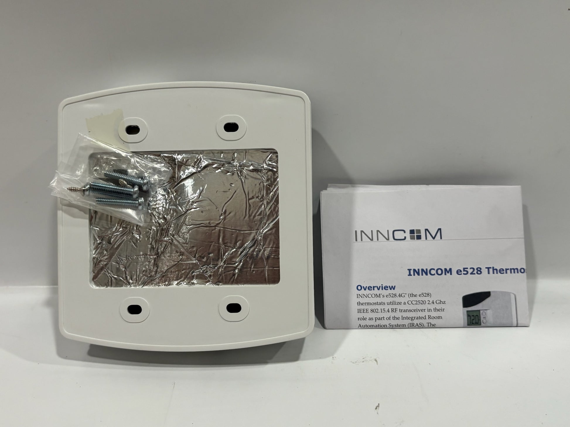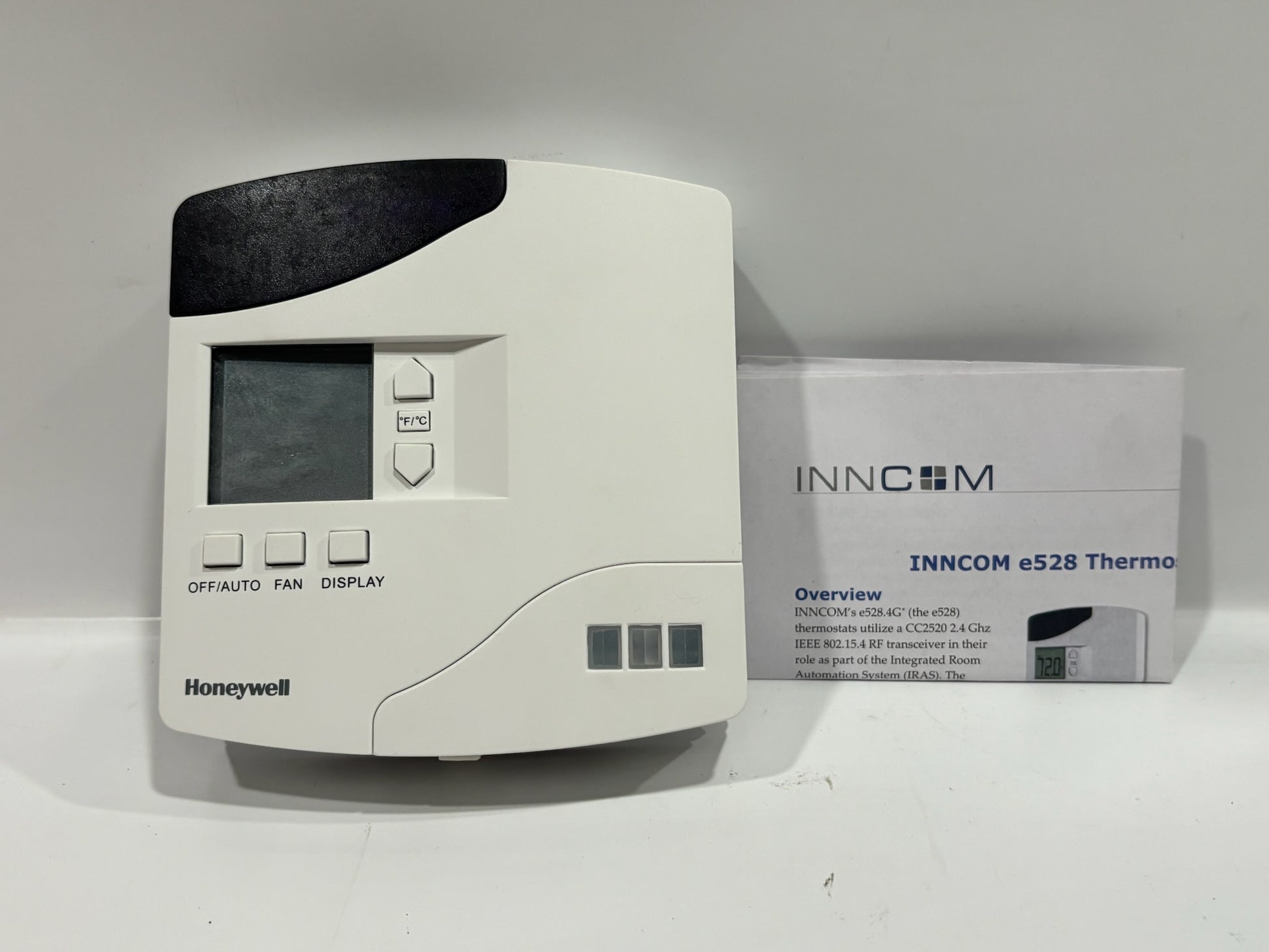 The Honeywell E528 is a smart digital thermostat designed for hospitality and commercial applications, featuring built-in motion and temperature sensors. It supports occupancy-based energy management with ecoMode to reduce HVAC costs when rooms are unoccupied. The E528 offers wired or wireless communication options and integrates with INNCOM systems for centralized control. Its sleek interface and flexible voltage compatibility make it ideal for guestroom automation and energy savings.