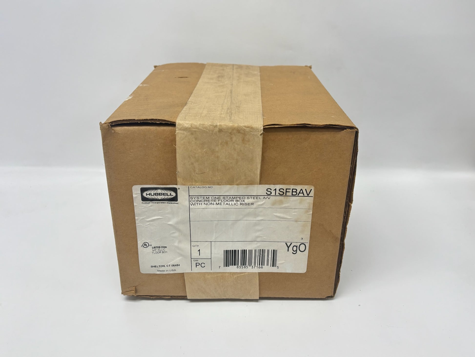The Hubbell S1SFBAV is a round flush-mount floor box designed for concrete-pour installations with a minimum depth of 3.50" and a capacity of 177.5 in³. It features pre-galvanized stamped steel construction with a PVC riser, adjustable leveling feet for pre-pour placement, and comes supplied with a concrete cover plus closure plugs. Knock-outs include concentric ¾" and 1" for power entries, and an oversized 1½" NPT threaded hub for data, making it ideal for high-capacity AV or multimedia service in open-plan spaces.