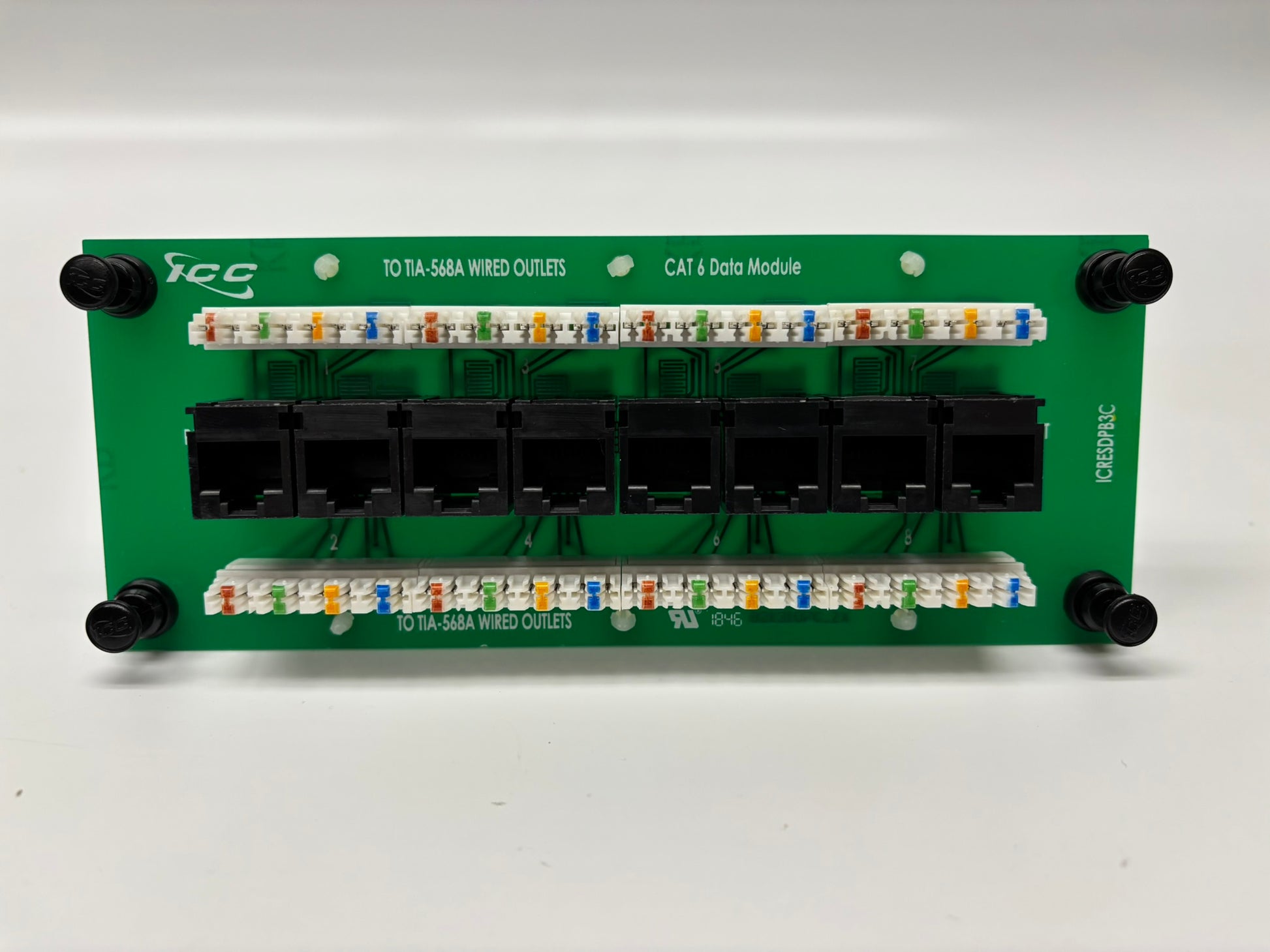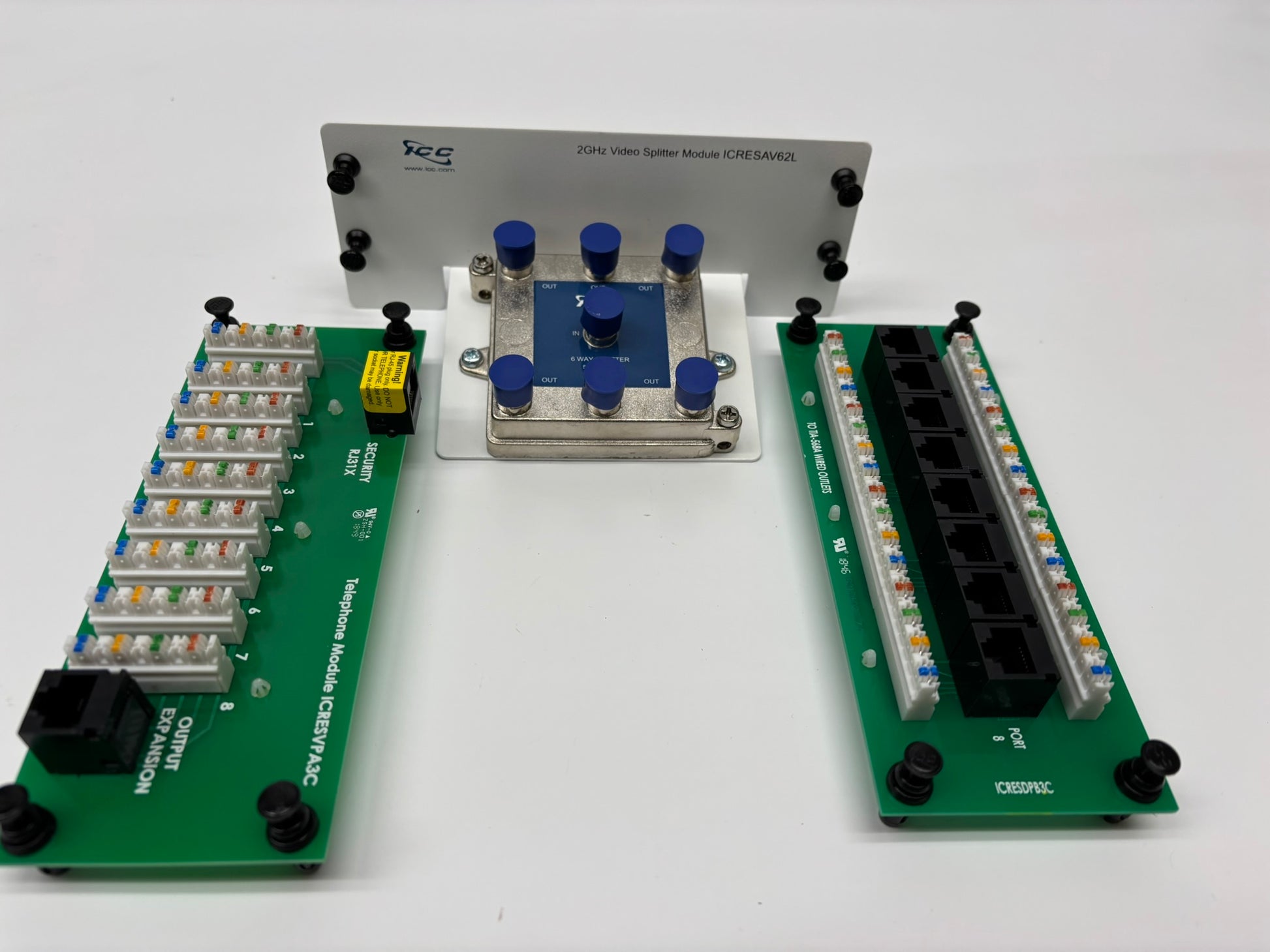 ICC Deluxe Series Video Module (ICRESAV62L) , w/ 8-Port CAT 6 Data Module (ICRESDPB3C) and 8-Port Telephone Module (ICRESVPA3C) w/ RJ31X Jack