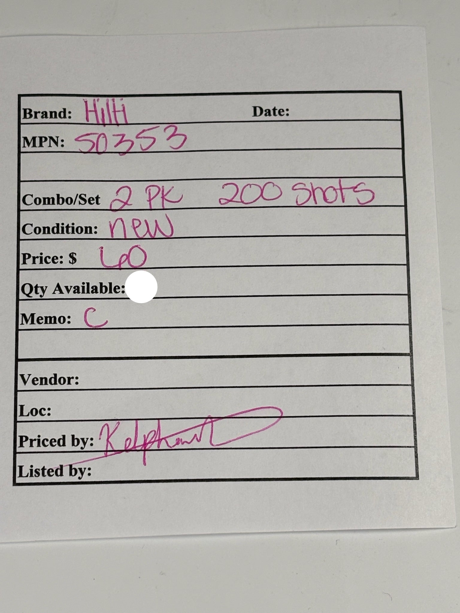 The Hilti 50353 is a box of 100 red 6.8/11M (.27 caliber) powder-actuated cartridges designed for heavy-duty fastening into concrete and steel. These cartridges are engineered for use with Hilti DX-series tools like the DX 2, DX 460/462, DX 351, DX 450, DX 36, DX A40, and DX A41, ensuring matched performance and optimal power delivery. Classified as power level "Heavy," they deliver high driving force suitable for demanding construction tasks. UL, PTB, and ANSI-approved, the 50353 cartridges offer consistent, reliable performance in industrial fastening applications.