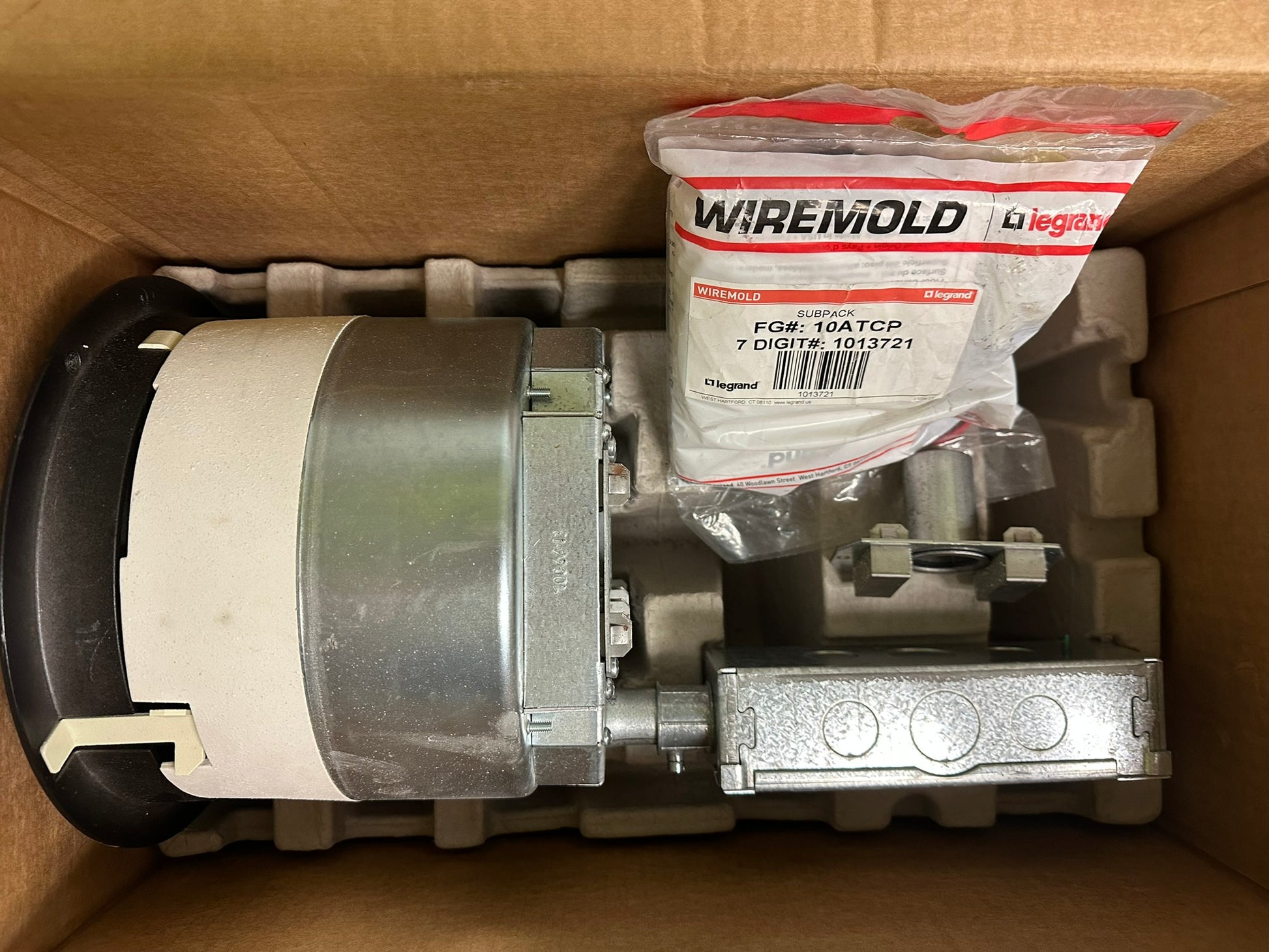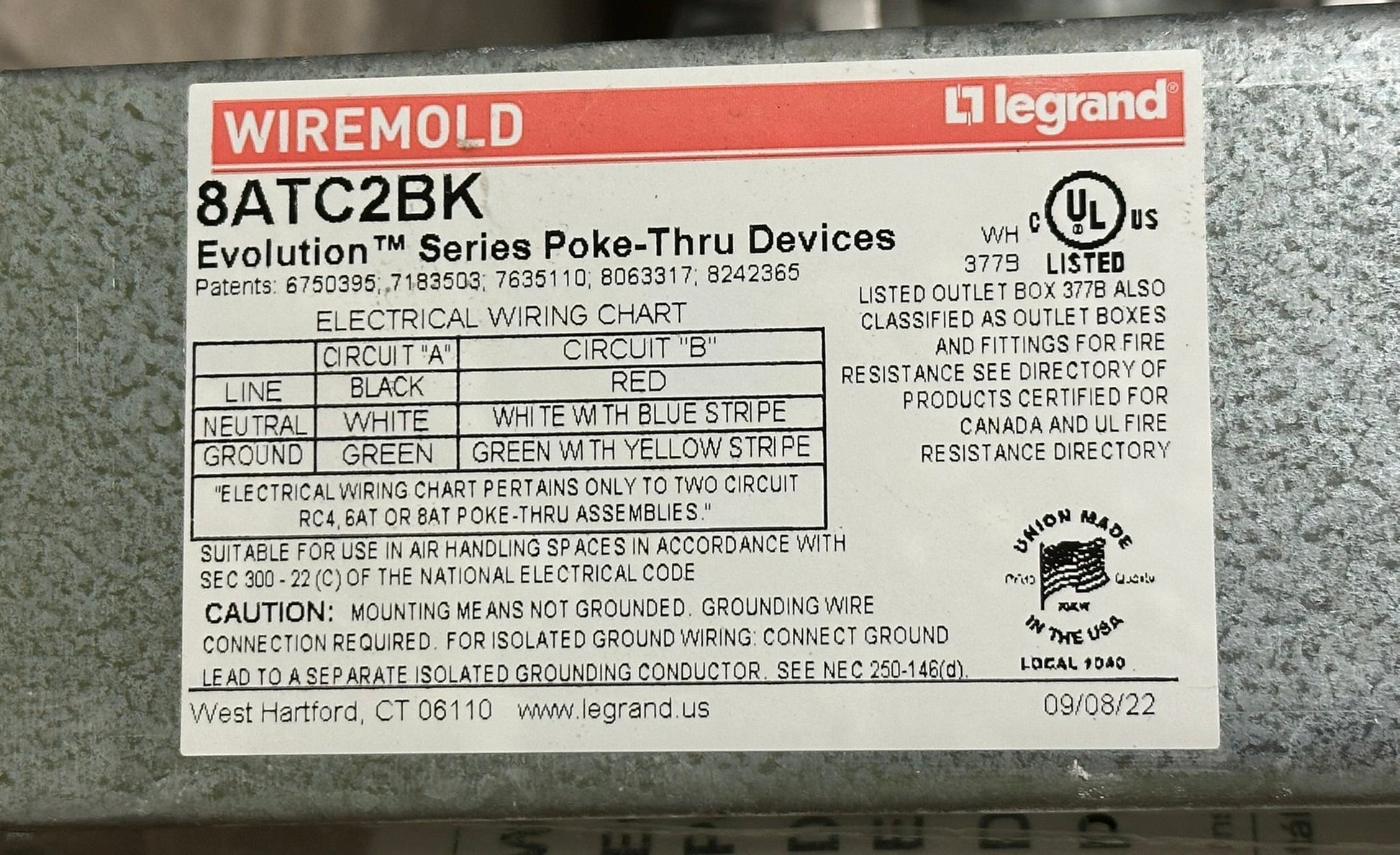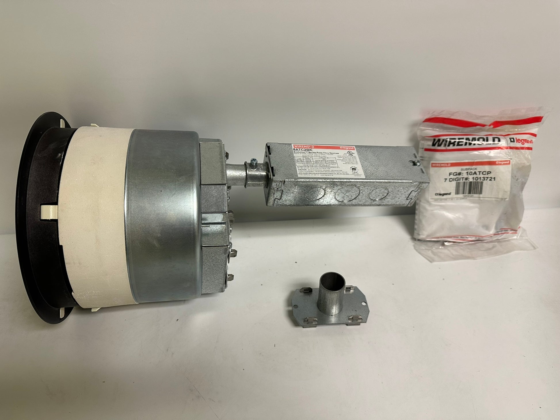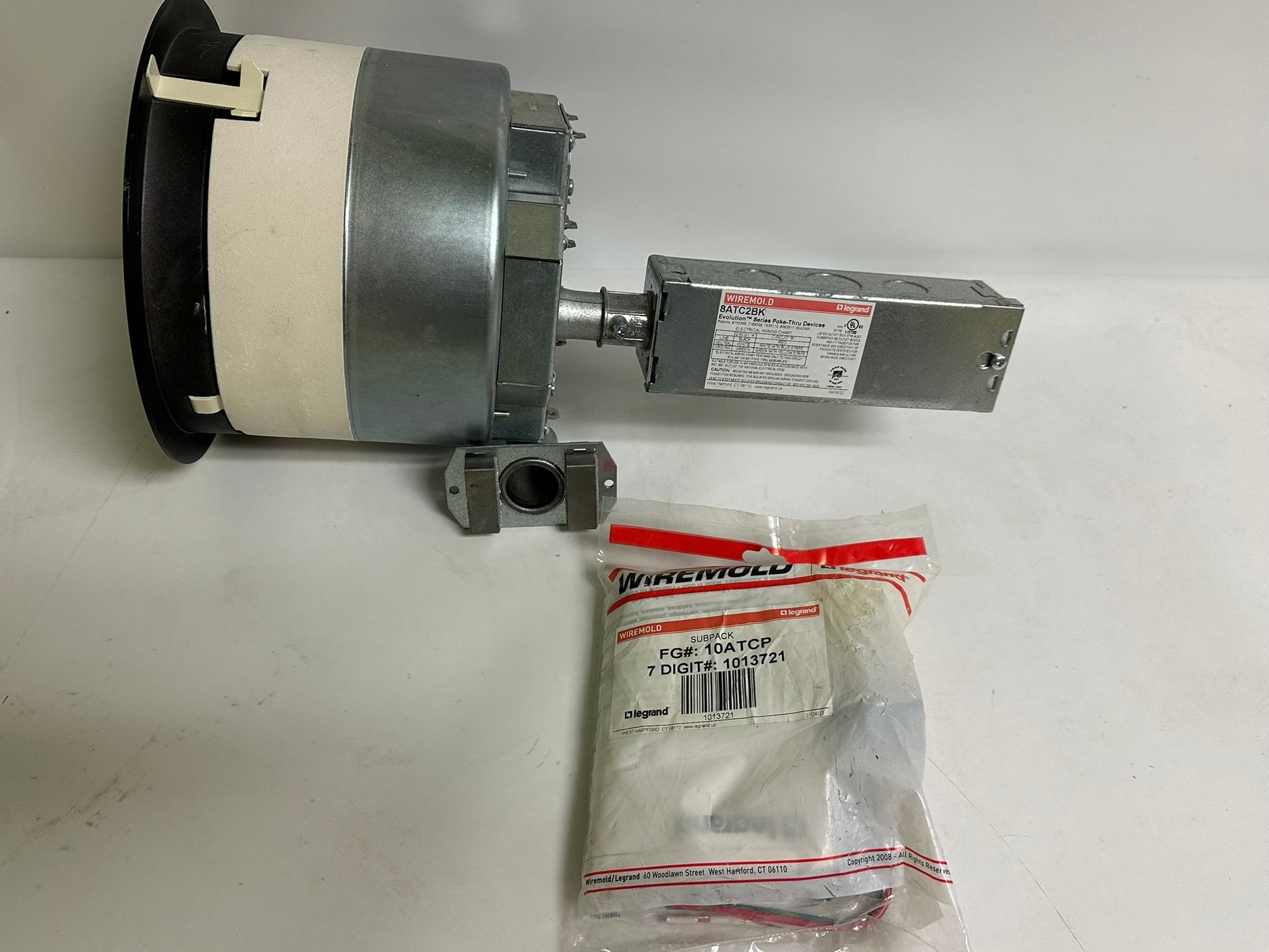 The Legrand 8ATC2BK is a new recessed poke-thru device designed for modern commercial spaces. It features a sleek black surface-style cover and a 3¼" recessed design that protects power, data, and A/V connections. The unit is UL Fire Classified for up to 2-hour rated floors, ensuring safety and compliance. Its die-cast aluminum cover opens 180° and includes spring-loaded egress doors for secure cable management. Compatible with industry-standard device plates, it allows easy customization. Ideal for use in tile, carpet, wood, or laminate flooring, it's a versatile and durable floor box solution.