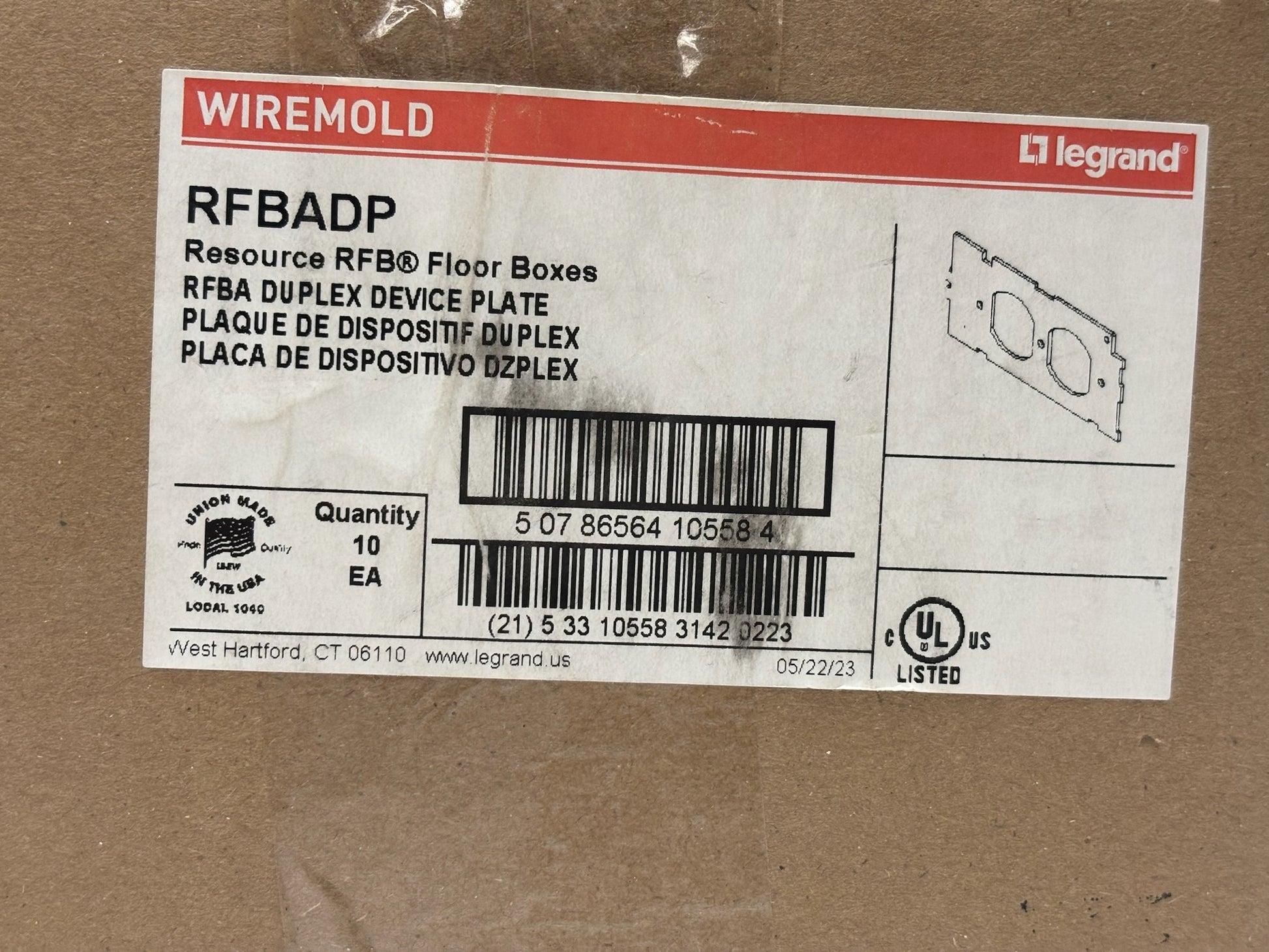 The Legrand RFBADP 10-Pack consists of ten duplex device plates designed for use with Legrand's RFBA Series floor boxes. These plates are crafted from durable steel with a gray finish, ensuring long-lasting performance and a sleek appearance. Each plate accommodates two standard devices, such as outlets or switches, providing convenient access to power and data connections in open spaces.