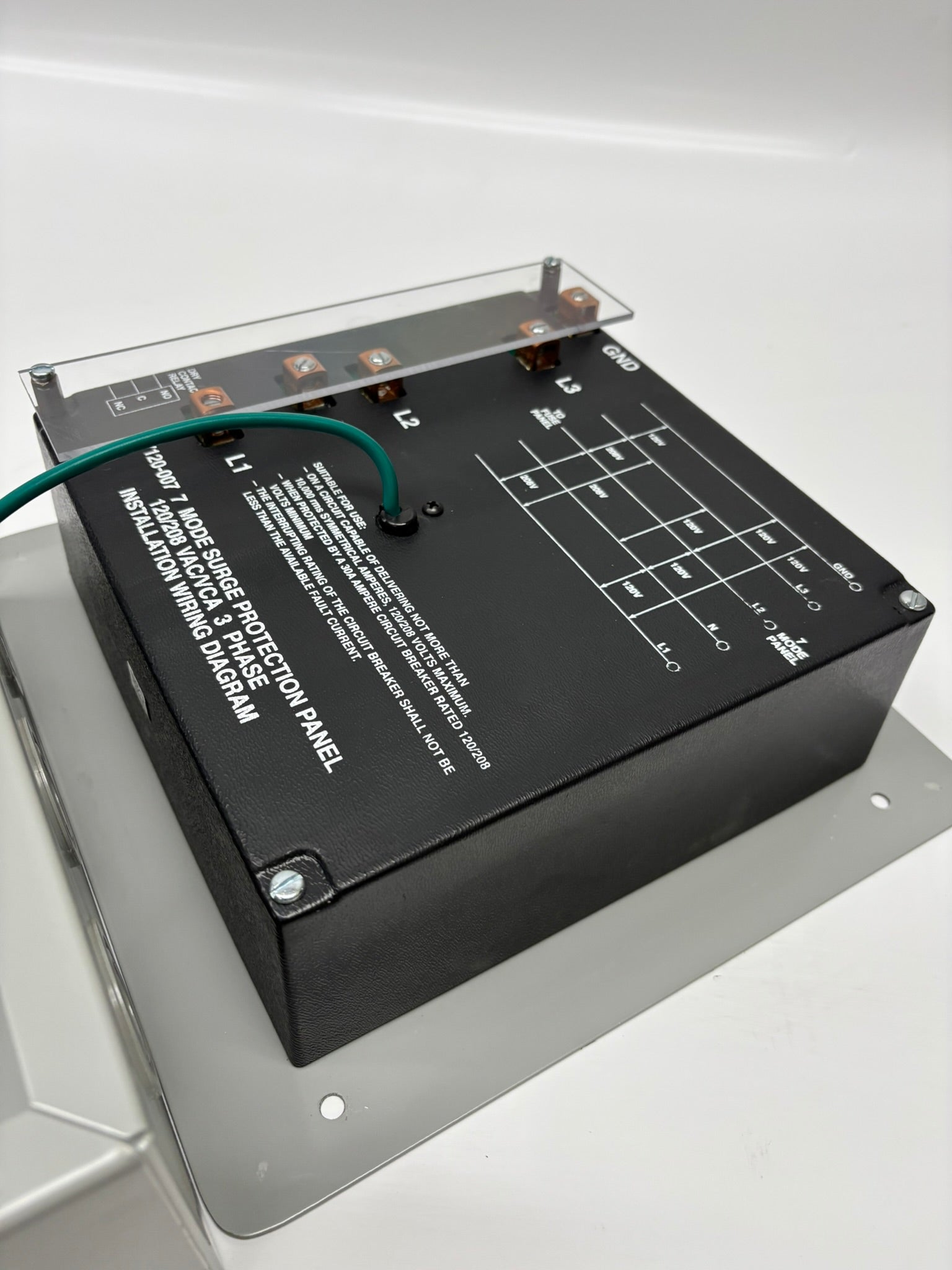 The Leviton 47000 Series 7-Mode Branch Panel Mount offers reliable surge protection with a 200kA rating per mode. Designed for 120/208V systems, it features a 4-wire + ground setup, LED diagnostics, and a NEMA 1 enclosure for durability. With MCOV of 140V AC and -40 dB noise rejection, it ensures low-clamping, high surge current capability and failsafe conditions for MOVs. Perfect for easy integration into any service ampacity, this unit delivers peace of mind with top-tier surge protection performance.