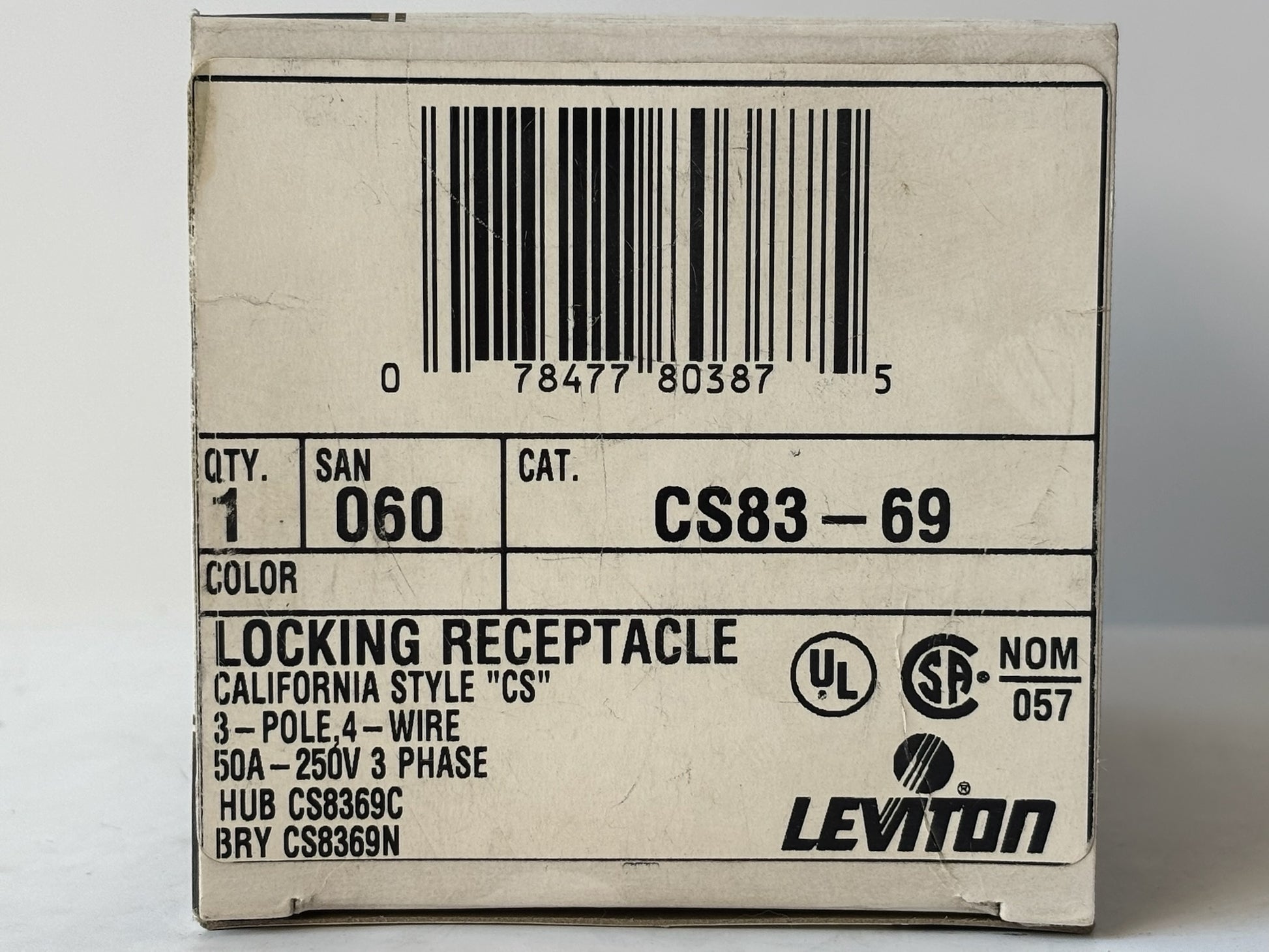 The Leviton CS8369 is a rugged, industrial‑grade,California‑style locking flush‑mount receptacle rated at 50 amps and 250 volts for 3‑phase service. It features a durable nylon body, one‑piece contacts to reduce friction and heat, and supports wire sizes from AWG 10 to 4. Operating between –40 °C and 75 °C, it’s certified for full current interrupting and withstands a 2000 V dielectric test.
