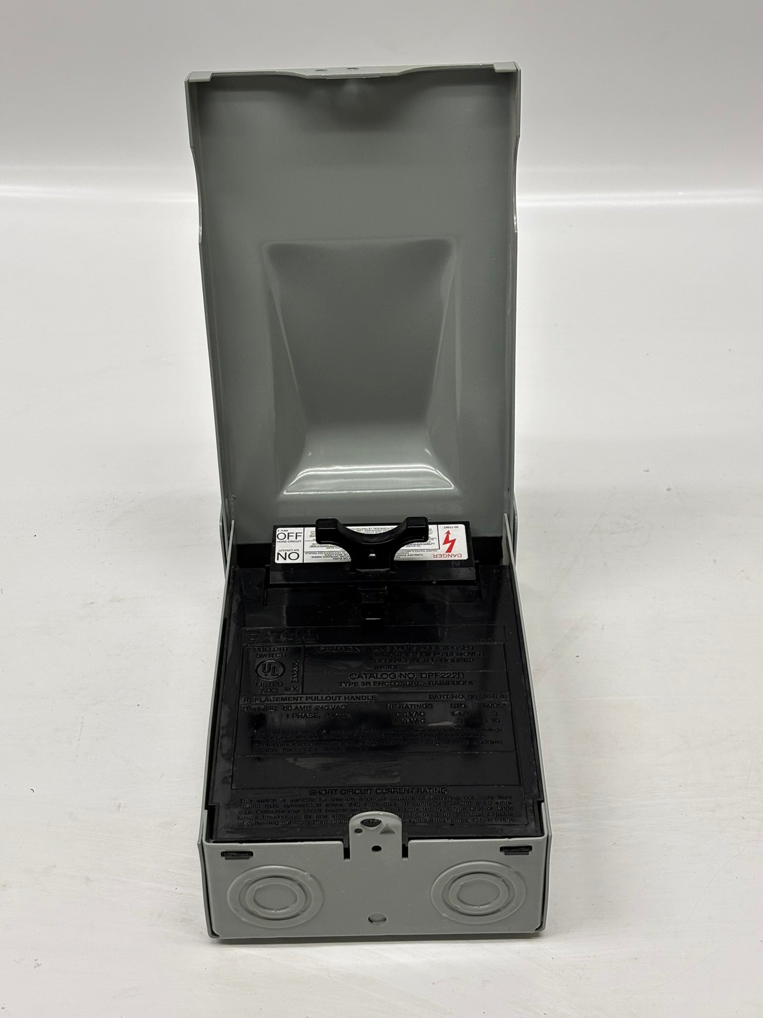The Eaton DPF222R is a 60-Amp, 1-Phase fusible pull-out AC disconnect switch designed for reliable on/off control of air conditioning systems, heat pumps, and water heaters. With a 120/240-Volt AC rating and NEMA 3R weatherproof enclosure, it is built for both indoor and outdoor use. The pull-out handle offers convenient operation, and it can be securely stored in the off position to prevent misplacement. Featuring a protective shield that ensures power is disconnected before the handle is removed, this disconnect switch offers safe, dependable operation for HVAC applications. UL listed and CSA certified.