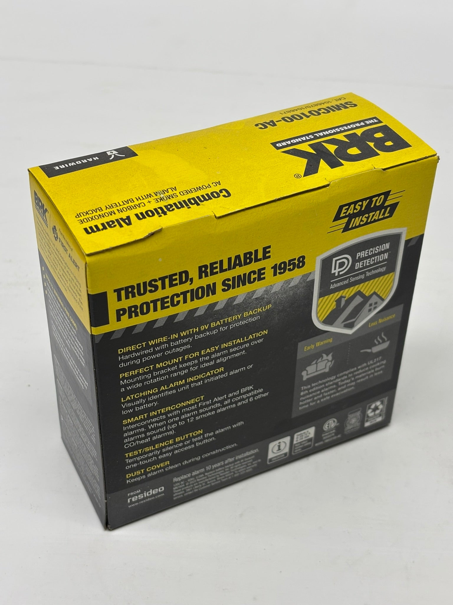 The BRK SMICO100-AC is a hardwired 2-in-1 smoke and carbon monoxide alarm with a 9V battery backup. It offers reliable protection during power outages and features Smart Interconnect, allowing it to link with up to 12 smoke alarms and 6 other CO/heat alarms. The latching alarm indicator helps identify the unit that triggered the alarm, while the Test/Silence button provides quick access for testing or silencing. Easy to install with a mounting bracket and dust cover for added convenience. Keep your home or business safe with this all-in-one detection solution.