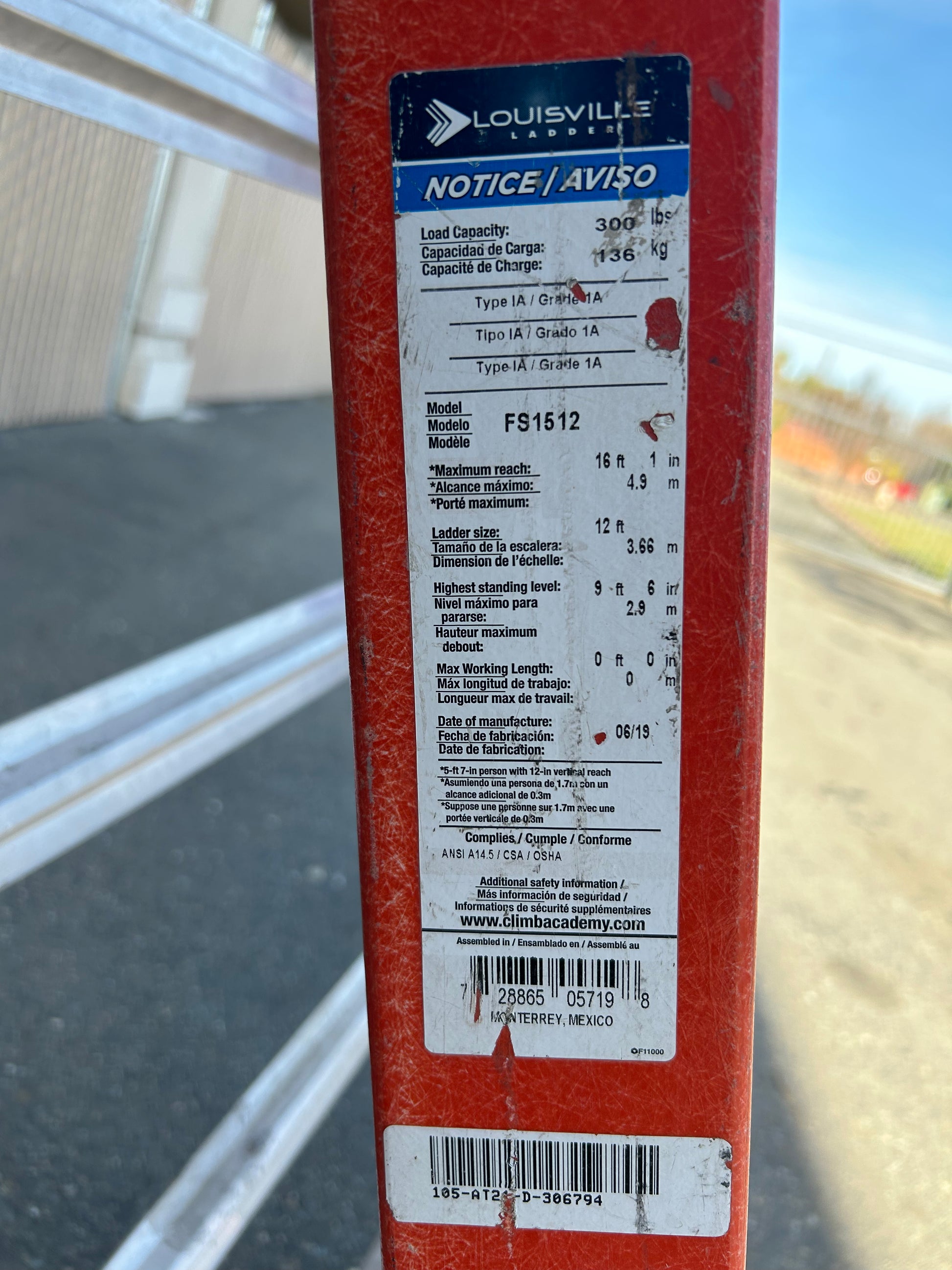 Louisville (FS1512) 12 Ft Ladder Fiberglass 300 lb Load Capacity 47 lb Wt (used)