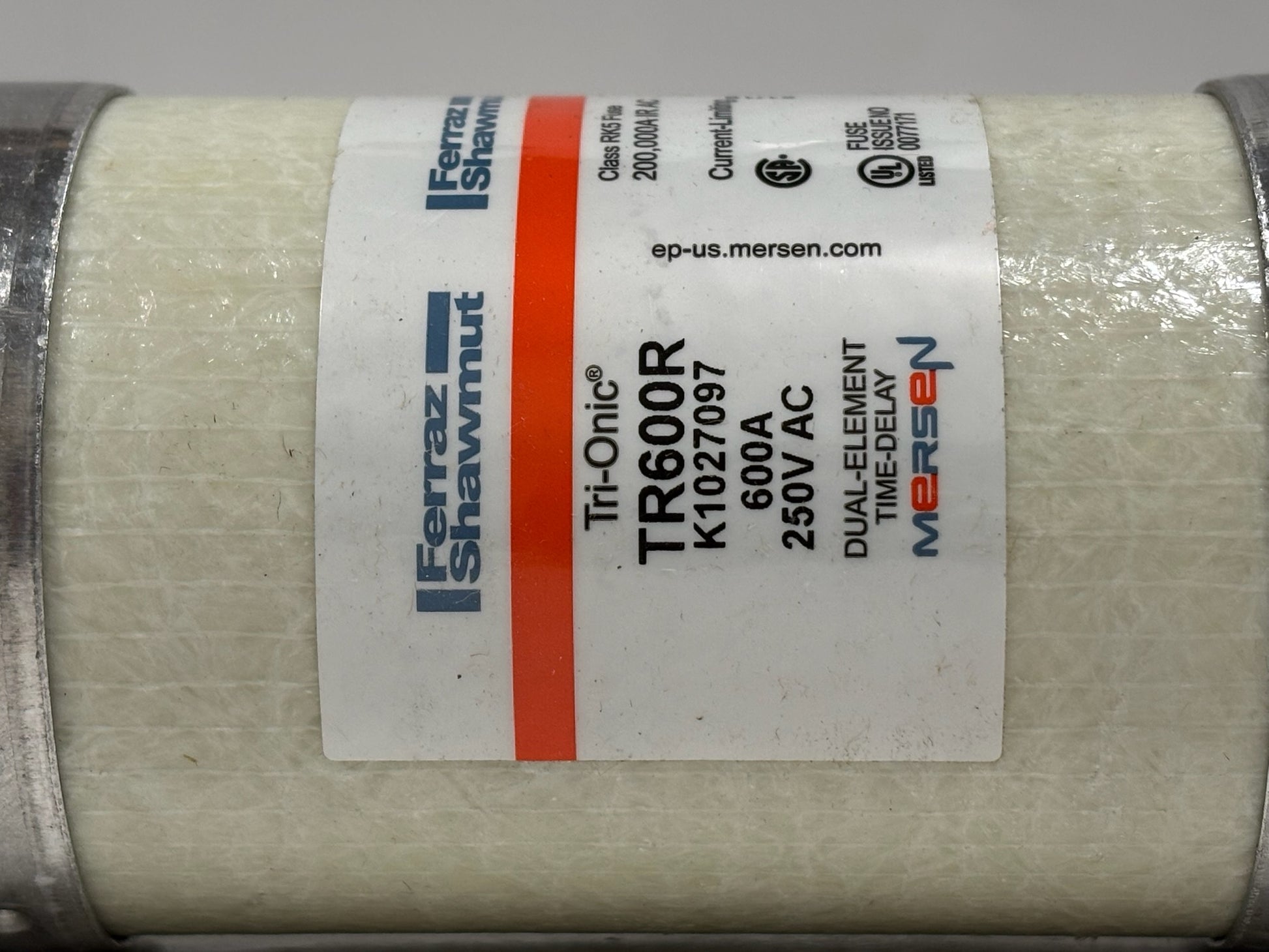The Mersen TR600R is a 600-amp Class RK5 time-delay fuse designed for reliable overcurrent protection in motor circuits and electrical equipment. It features a 250V AC and 160V DC rating with a current-limiting design to prevent damage from short circuits. Its time-delay capability allows temporary inrush currents during startup without nuisance trips. UL and CSA certified, this fuse ensures safety and durability in demanding industrial applications.