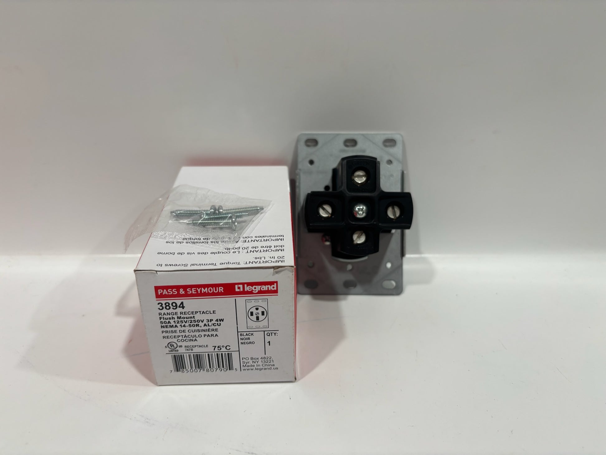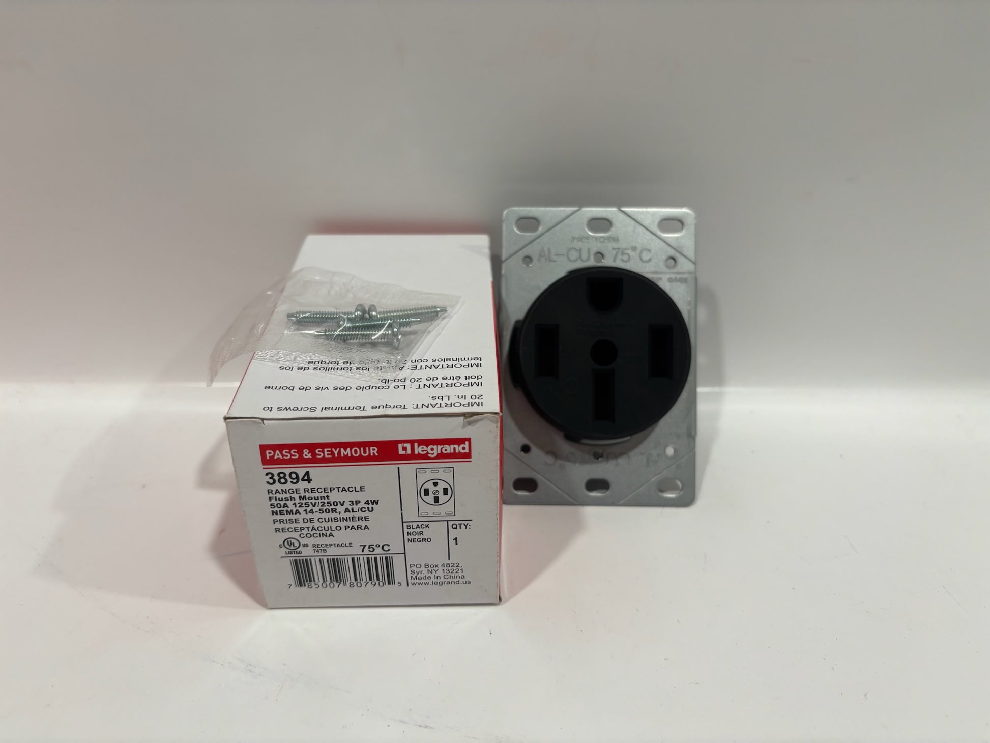 The Legrand 3894 Flush Mount Range Receptacle is a heavy-duty, straight-blade power outlet designed for residential and commercial applications requiring high-amperage connections. It features a NEMA 14-50R configuration, providing 50 amps of power at 125/250 volts. The receptacle is constructed with thermoplastic materials, ensuring durability and resistance to wear, and is UL and CSA listed for safety and compliance. Its flush-mount design allows for a clean installation, making it ideal for both new constructions and retrofits.