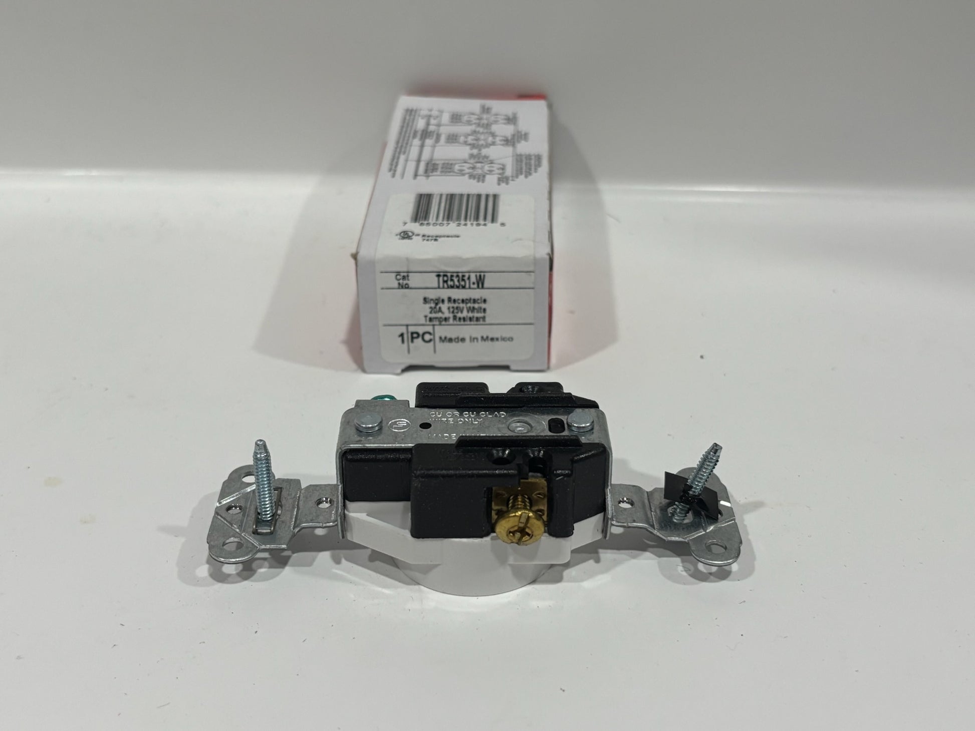 The Legrand TR5351-W is a spec-grade, tamper-resistant duplex outlet designed for high-demand commercial or residential applications. Its tamper-resistant shutters help prevent the insertion of foreign objects, enhancing child safety without compromising performance. Built to meet rigorous NEC requirements, this 20A outlet features a durable thermoplastic construction and a sleek white finish that blends seamlessly into modern interiors.