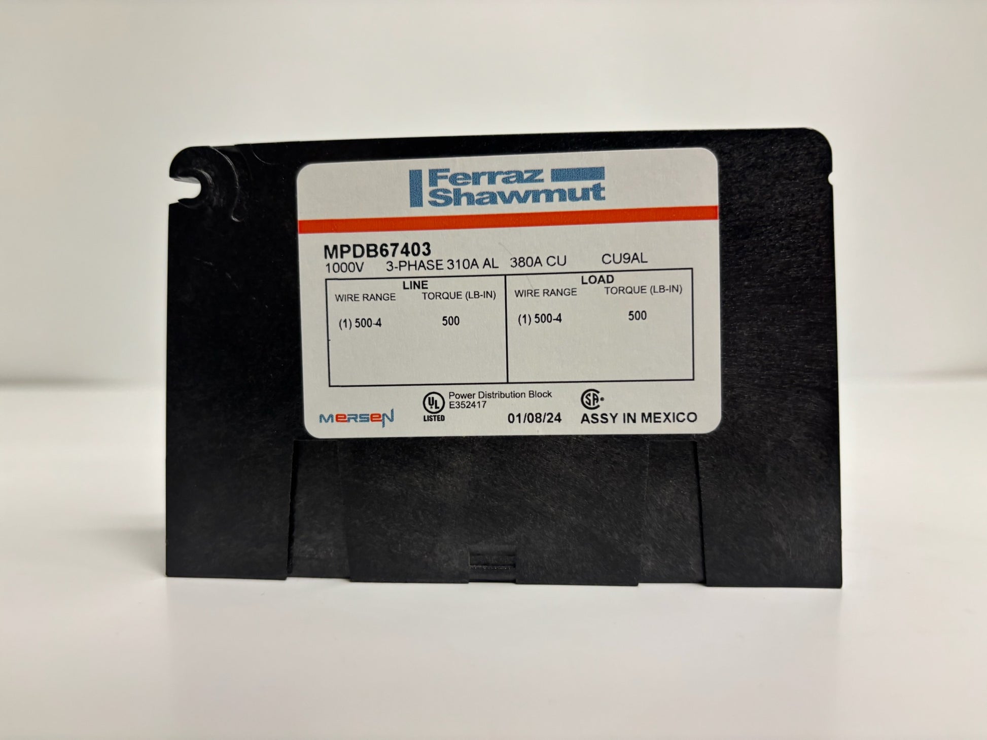 The Mersen MPDB67403 is a robust 3-pole power distribution block designed for high-current applications up to 380A. It features tin-plated aluminum connectors compatible with 4 AWG to 500 kcmil aluminum conductors, ensuring excellent conductivity and corrosion resistance. The block is constructed with a glass-filled polycarbonate housing, providing durability and compliance with UL 94-V0 flammability standards. Additionally, it includes hinged safety covers with test probe holes, enhancing safety during maintenance and operation.
