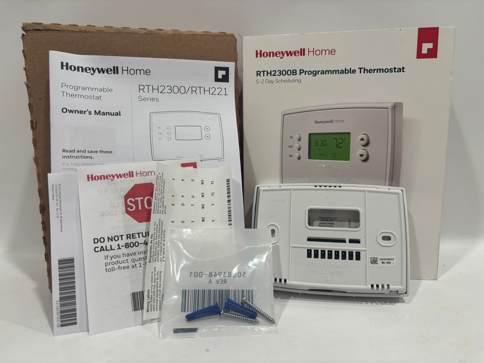 The Honeywell RTH2300B 5-2 Day Programmable Thermostat offers customizable scheduling for weekdays and weekends, allowing users to set different temperature settings for added comfort and energy savings. This model supports heating and cooling systems and is compatible with gas, oil, or electric furnaces. Its backlit digital display provides clear visibility of temperature readings and programming options. Easy to install and user-friendly, the RTH2300B is ideal for homeowners looking to improve climate control efficiency.