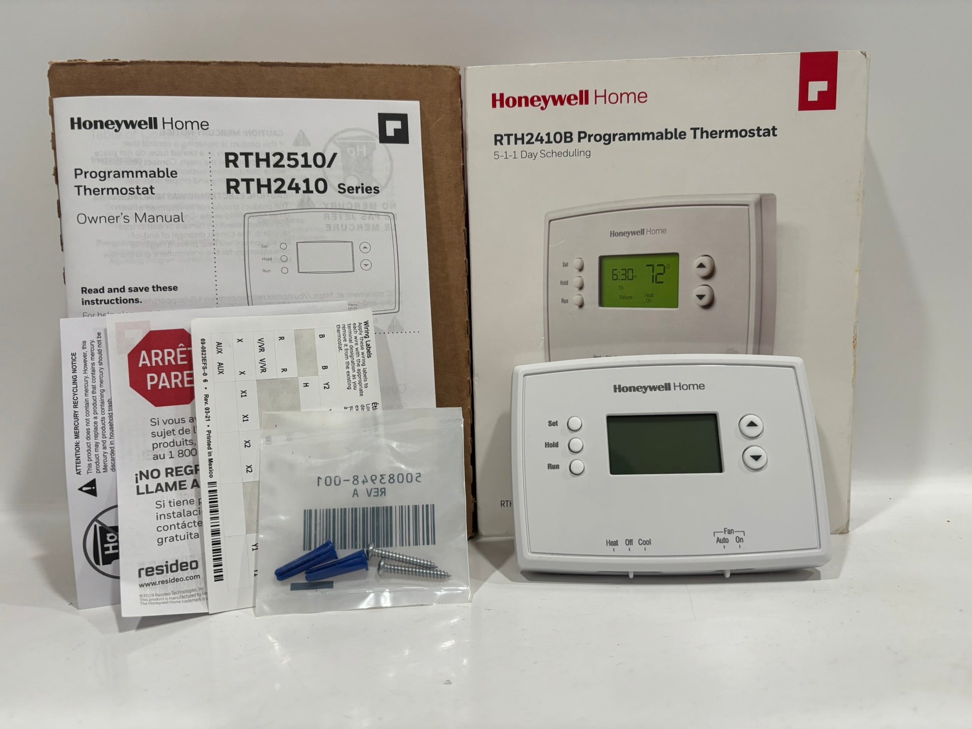 The Honeywell RTH2410B Programmable Thermostat 10-pack features 5-1-1 day programming, allowing you to set one schedule for weekdays and another for weekends. Each thermostat supports single-stage heating and cooling systems and is compatible with gas, oil, or electric furnaces and central air conditioning. The clear backlit display shows room temperature, set point, and system status for easy monitoring. It also includes built-in compressor protection and precise temperature control for increased system efficiency and comfort.