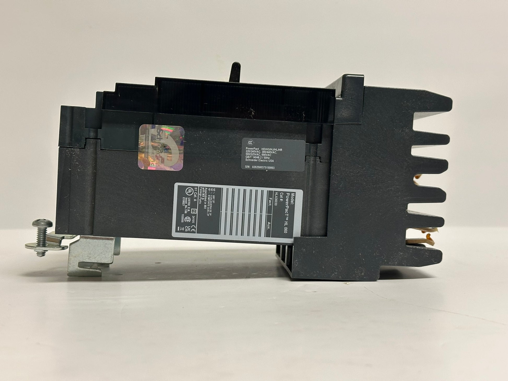 The Square D Schneider Electric HLA36030 is a 30A, 3-pole molded case circuit breaker from Schneider Electric’s PowerPact H series, designed for use in I-Line panelboards. It operates at 600V AC and provides thermal-magnetic protection with long-time and instantaneous trip functions. The breaker features a high interrupting rating of 50 kA at 600V, ensuring reliable protection in commercial and industrial applications. It is UL listed and complies with CSA, NOM, and IEC standards, making it suitable for various electrical systems. The HLA36030 is RoHS compliant and is calibrated for use in environments up to 40°C.