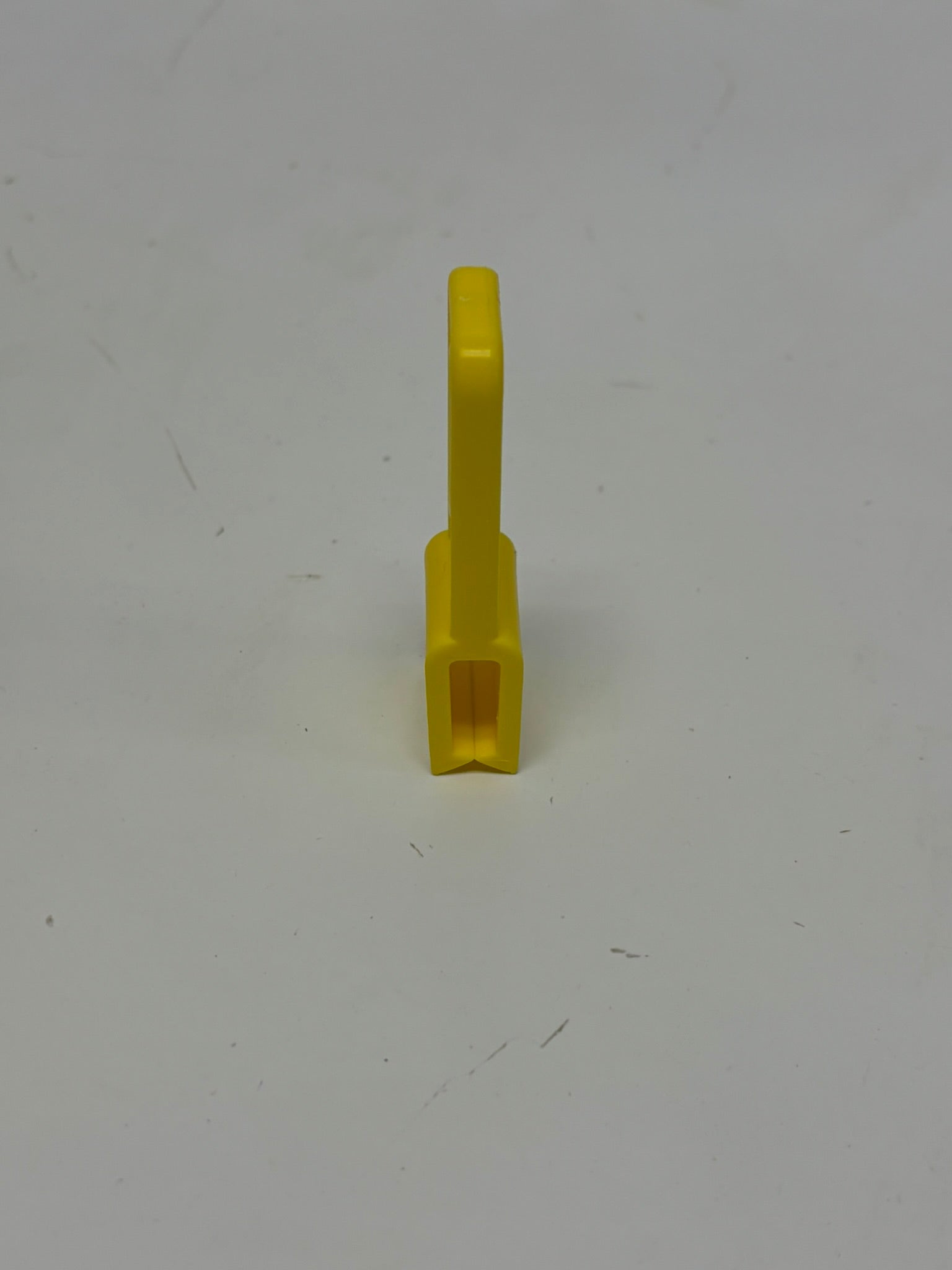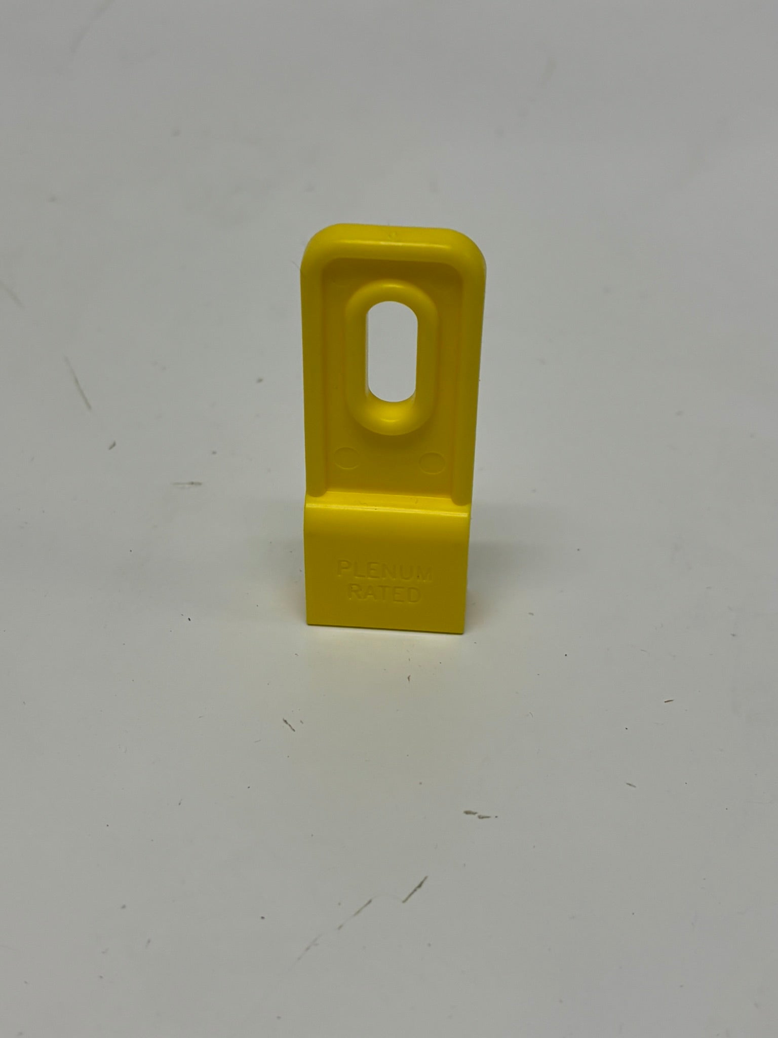 The nVent CADDY EC311P is a plenum-rated plastic electrical drop wire securing clip designed to stabilize dedicated electrical drop wires or rods in ceiling grid systems. Made from yellow polypropylene for easy identification, it features a 1/4-inch hole and a forgiving design that requires no tools for installation, accommodating slight variations in wire or rod lengths without compromising ceiling integrity.