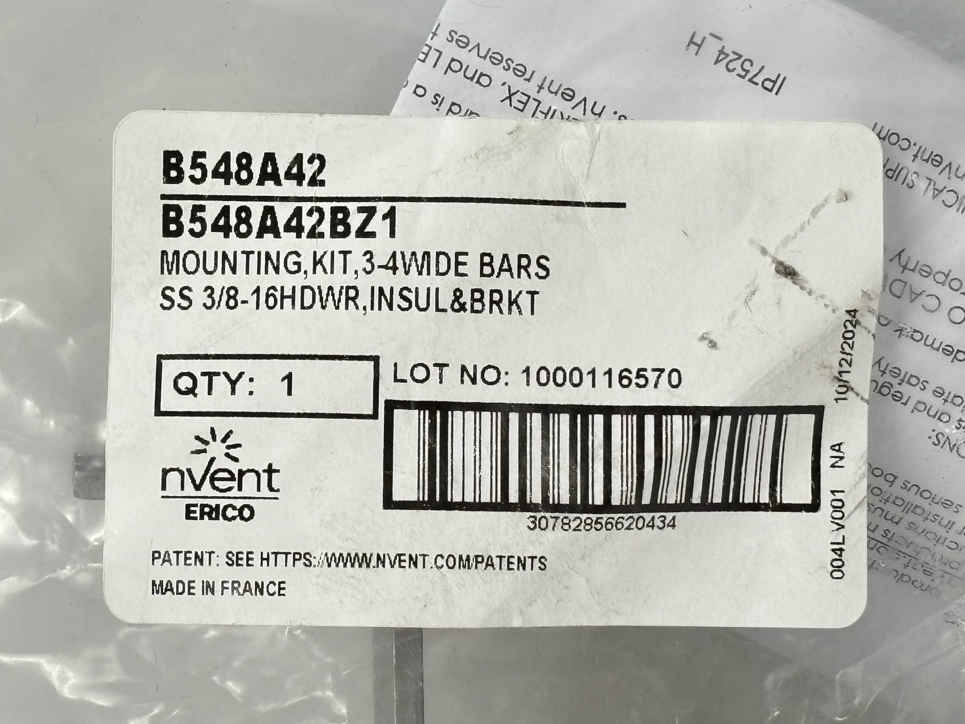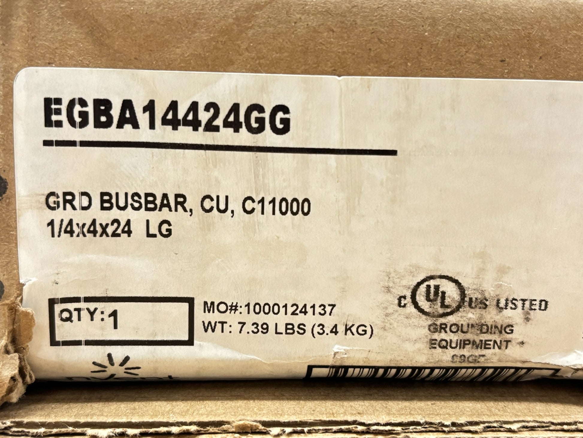 The EGBA14424GG is a copper grounding busbar assembly complete with insulators and mounting brackets, measuring 24" × 4" × 0.25". It includes the “GG” hole pattern (0.438" hole diameter) compatible with standard grounding hardware. The bar facilitates a common bonding point for equipment grounding or lightning protection systems, allowing conductors to be welded (e.g. Cadweld) or mechanically fastened. cULus listed (UL 96), it supports robust and reliable grounding installations.