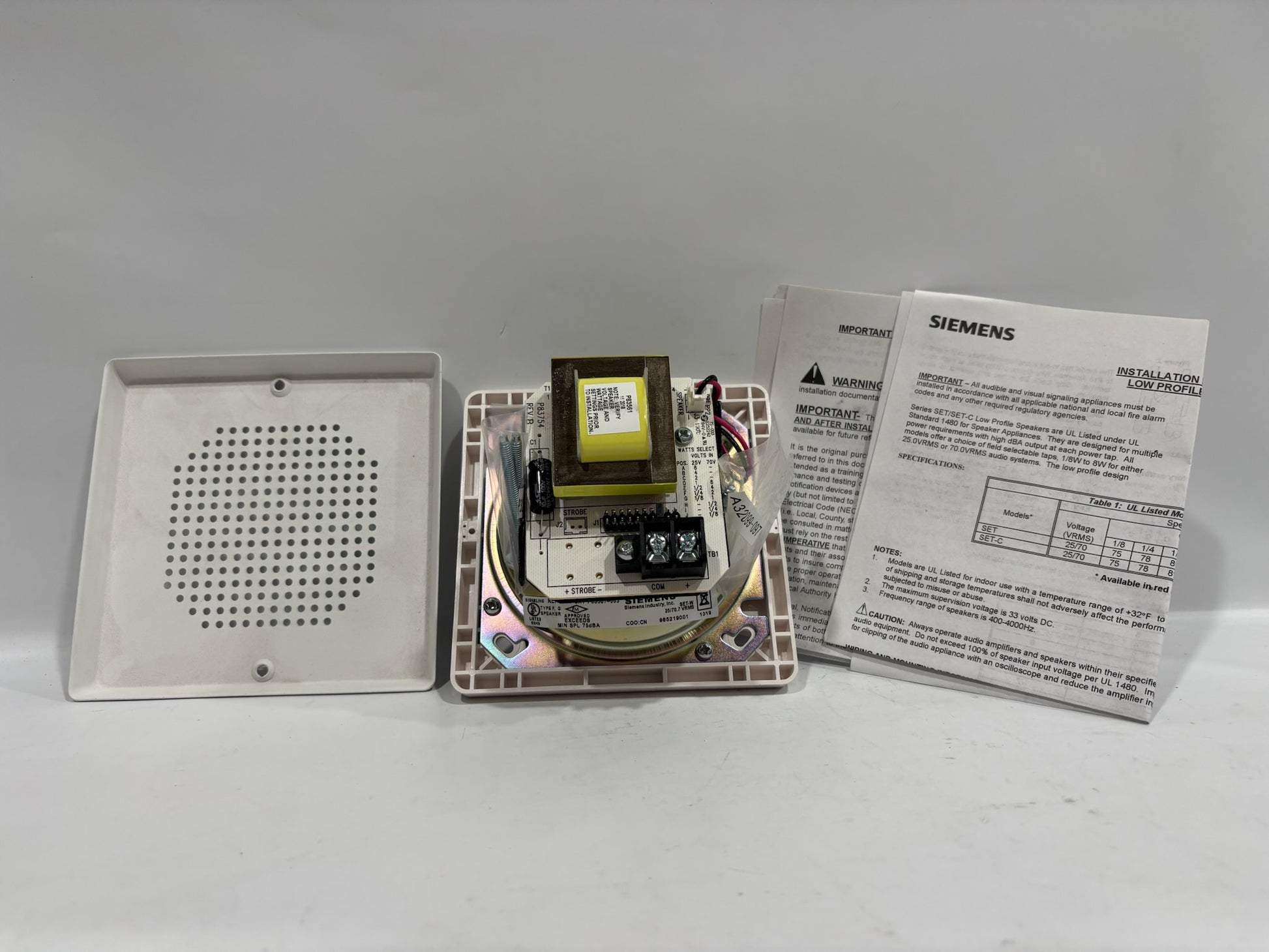 The SIEMENS 500-636056 SET-W is a wall-mounted fire alarm audible signal speaker designed to deliver clear and reliable sound during emergency situations. It operates at 25/70.7 VRMS, ensuring compatibility with various fire alarm systems.