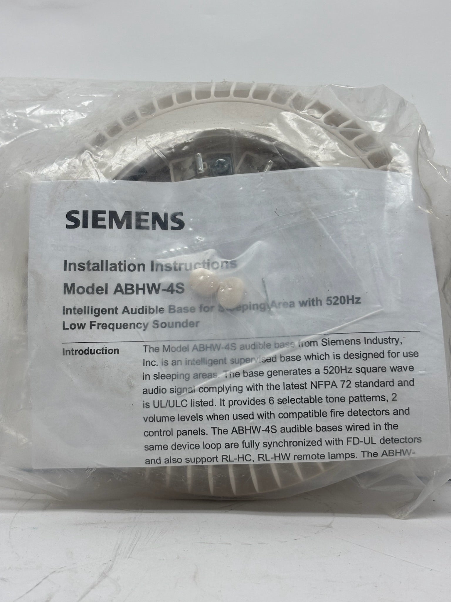 The Siemens ABHW-4S is an advanced, supervised audible detector base specifically designed for sleeping area applications. It emits a 520 Hz square-wave audio signal, meeting NFPA 72 low-frequency requirements and several UL/ULC listings