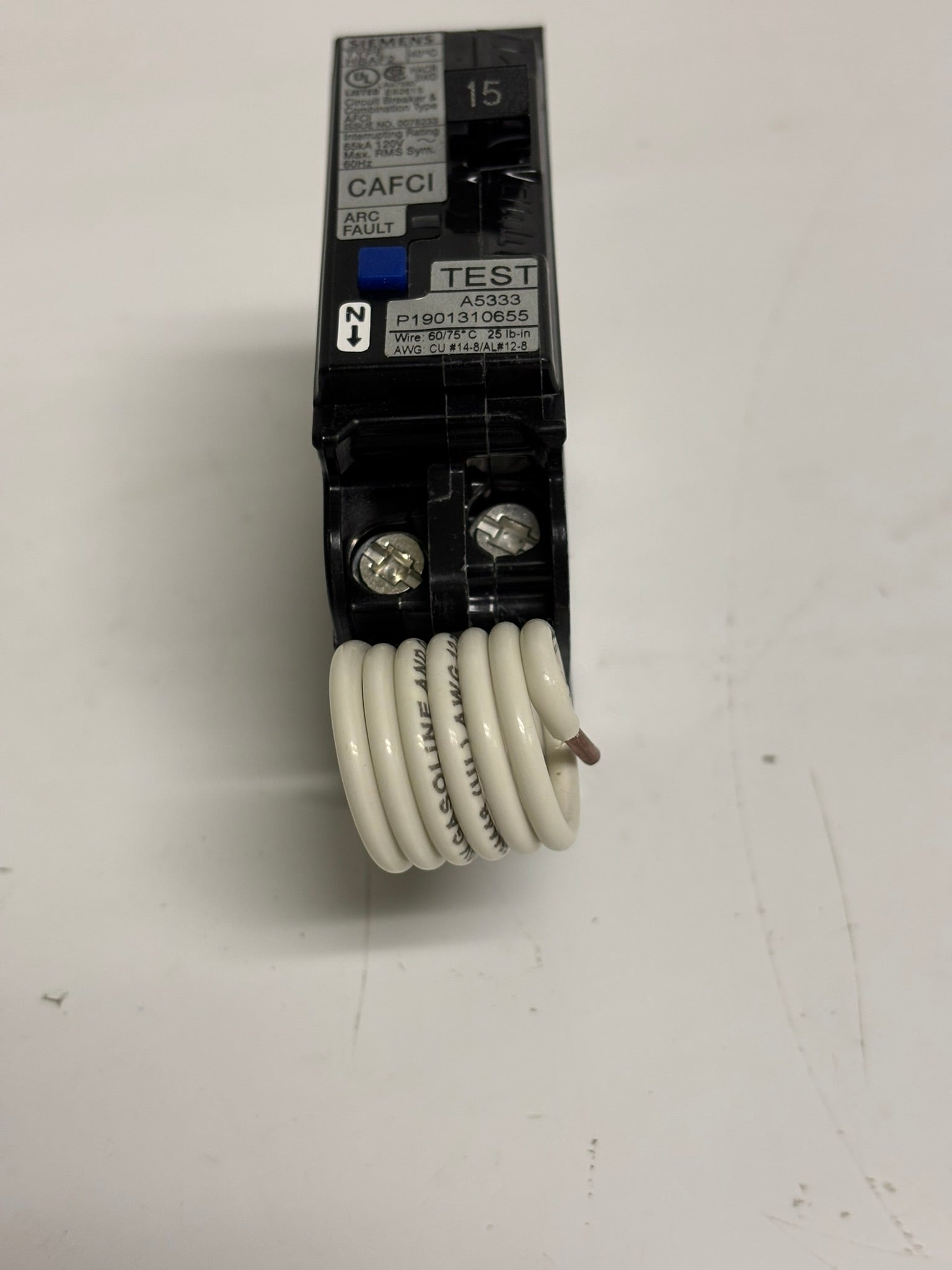 Siemens Low Voltage Molded Case Circuit Breakers with panelboard mounting are designed for advanced circuit protection in residential and commercial applications. The 15A, 1-pole HBAF2 combination AFCI breaker operates at 120V and offers a high interrupting capacity of 65kA, ensuring reliable arc fault protection. Rated at 120/240VAC with a 22kAIC rating, the BAFH series provides dependable safety against electrical fires caused by arc faults.