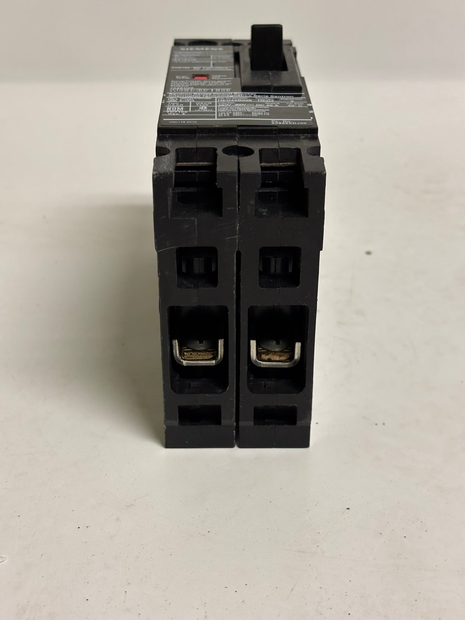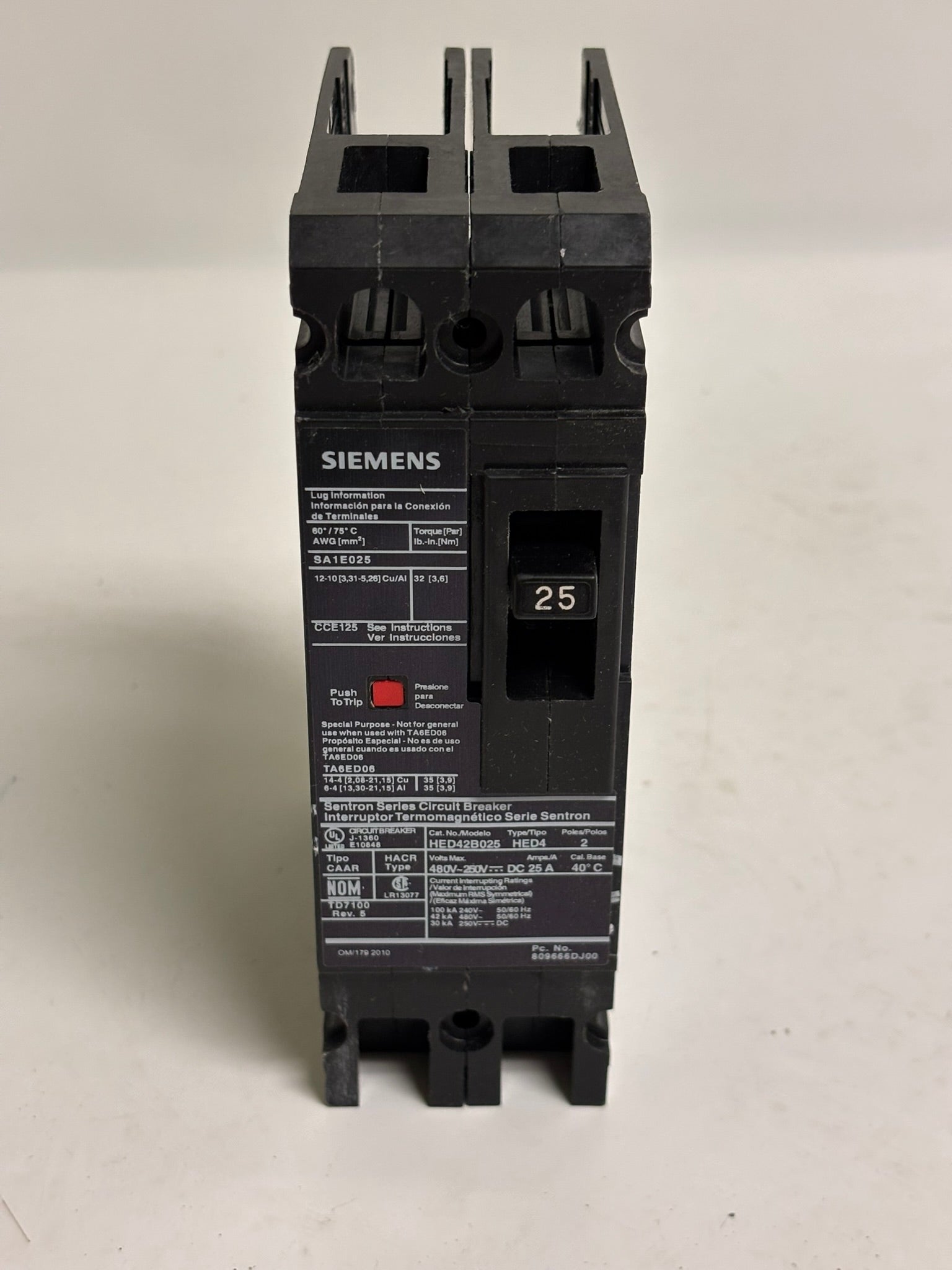 The Siemens HED42B025 is a 2 Pole thermal magnetic molded case circuit breaker with a current rating of 25 Amps and a voltage rating of 480VAC. It has an interrupting rating of 42kAIC at 480V. The HED42B025 has a bolt-on connection type and includes long time and instantaneous trip functions.