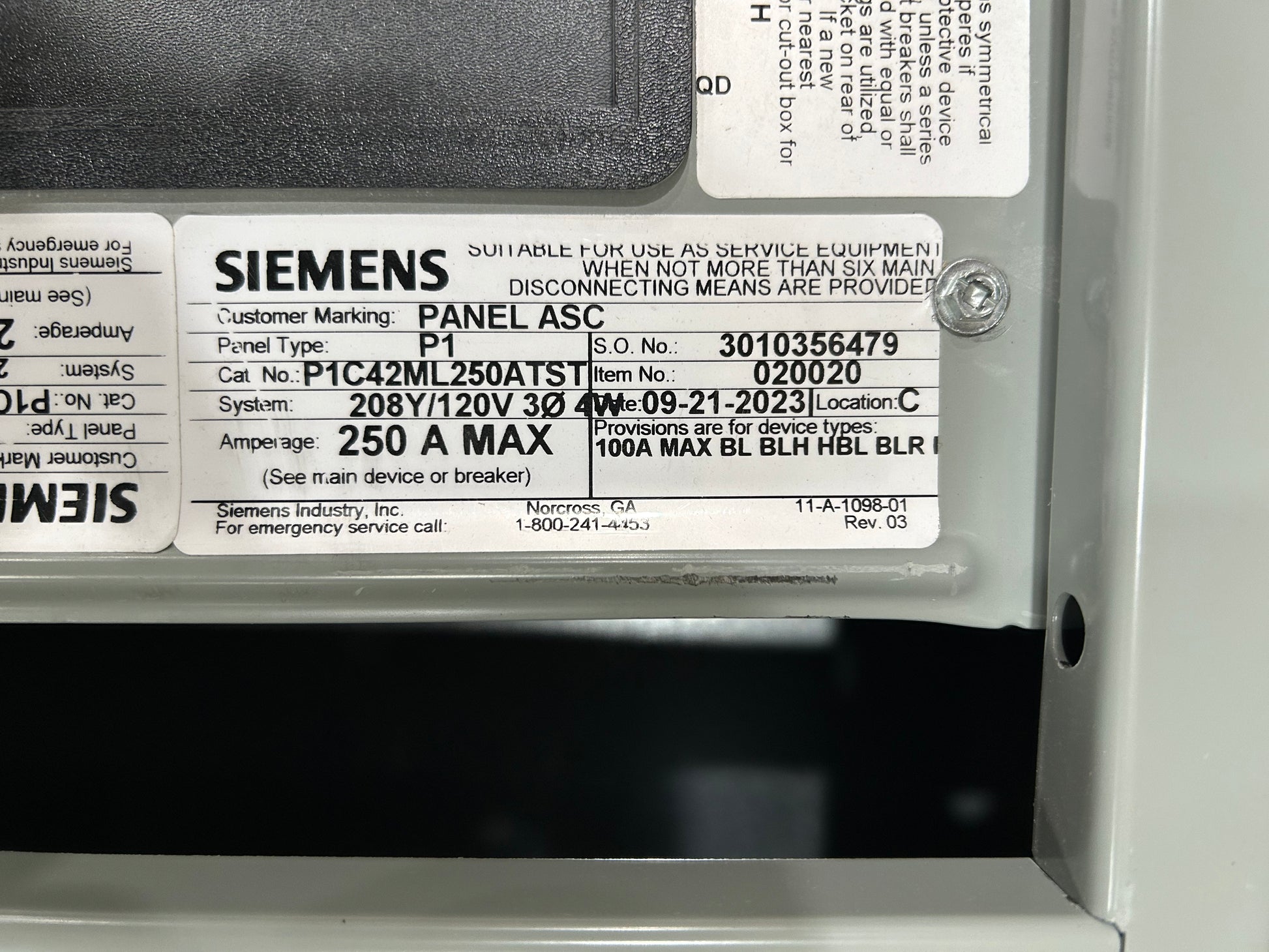SIEMENS P1C42ML250ATST 250AMP MAIN LUG PANEL 208Y/120V 42 CIRCUIT 3-PHASE