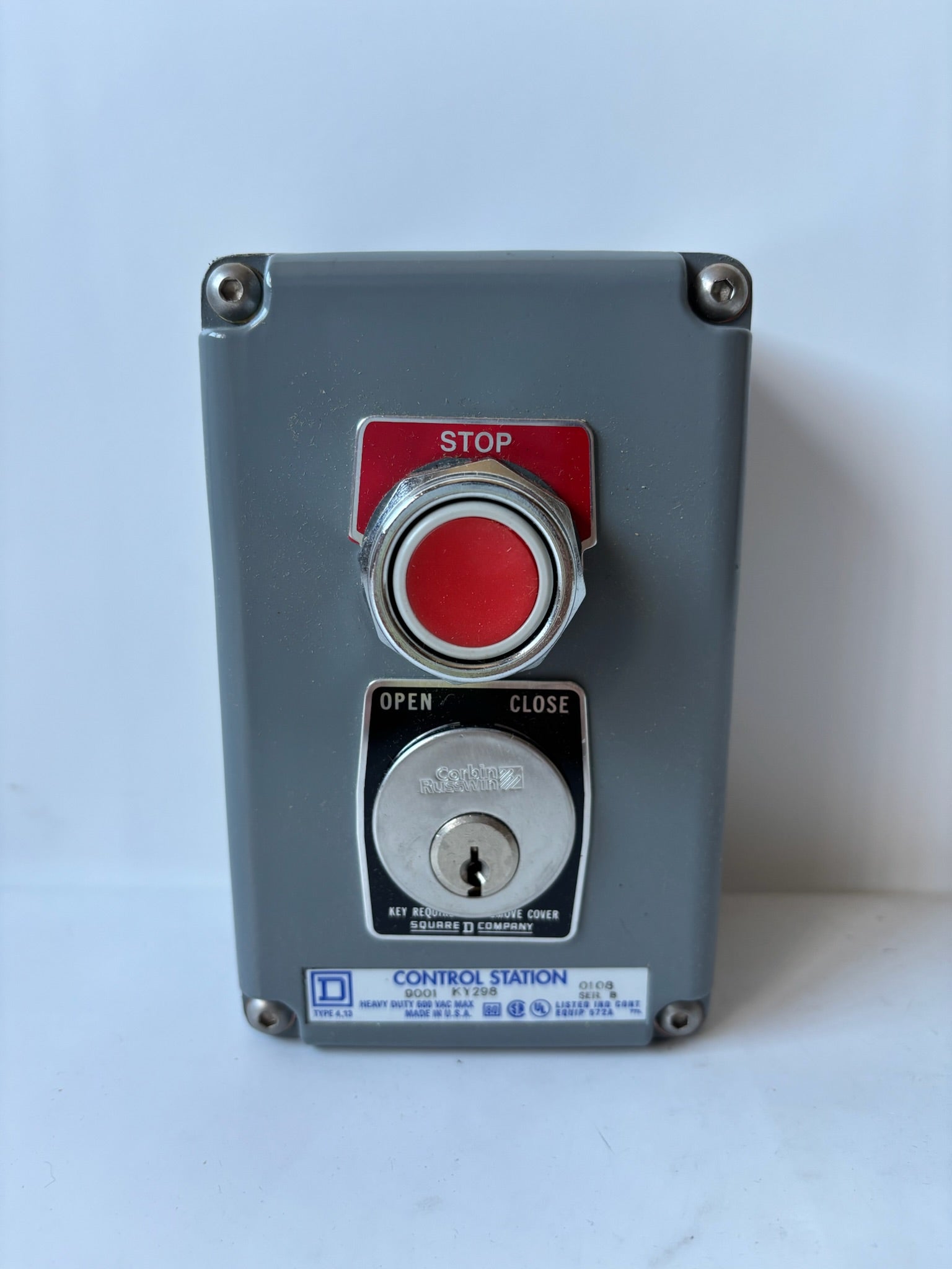 The Square D 9001 KY-298 Open Close Stop Station is a heavy-duty control station designed for industrial applications requiring secure and reliable operation. It features a key-operated selector switch with an "Open-Close-Stop" legend, providing clear indication and preventing unauthorized operation.