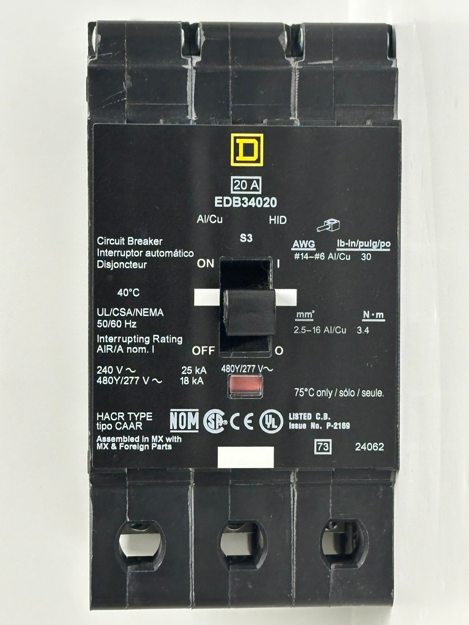 Square D EDB34020 20A 3-Pole 480Y/277V Bolt-On Circuit Breaker