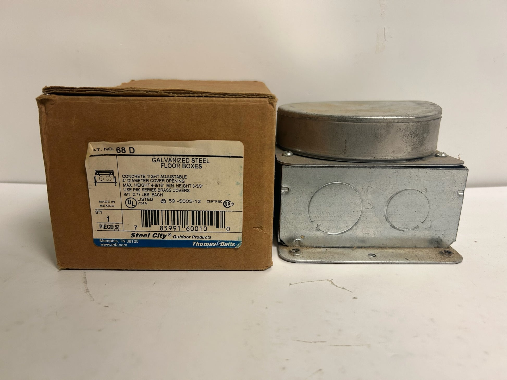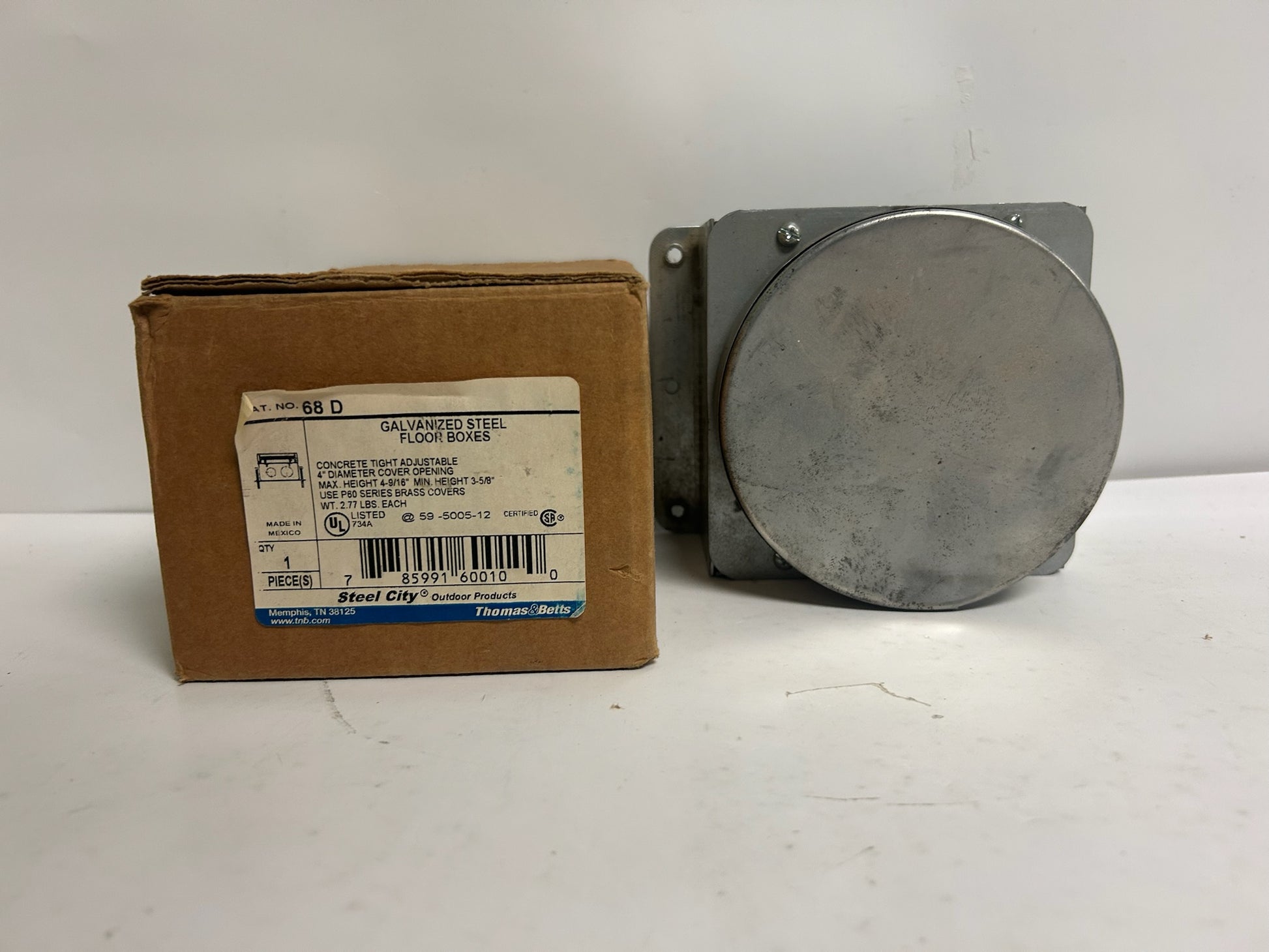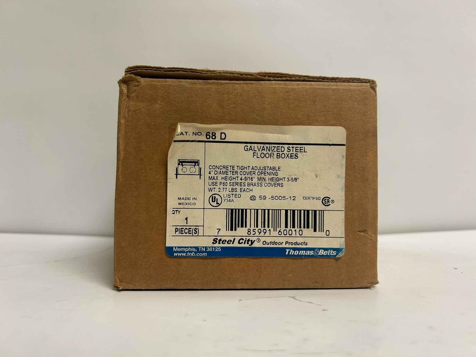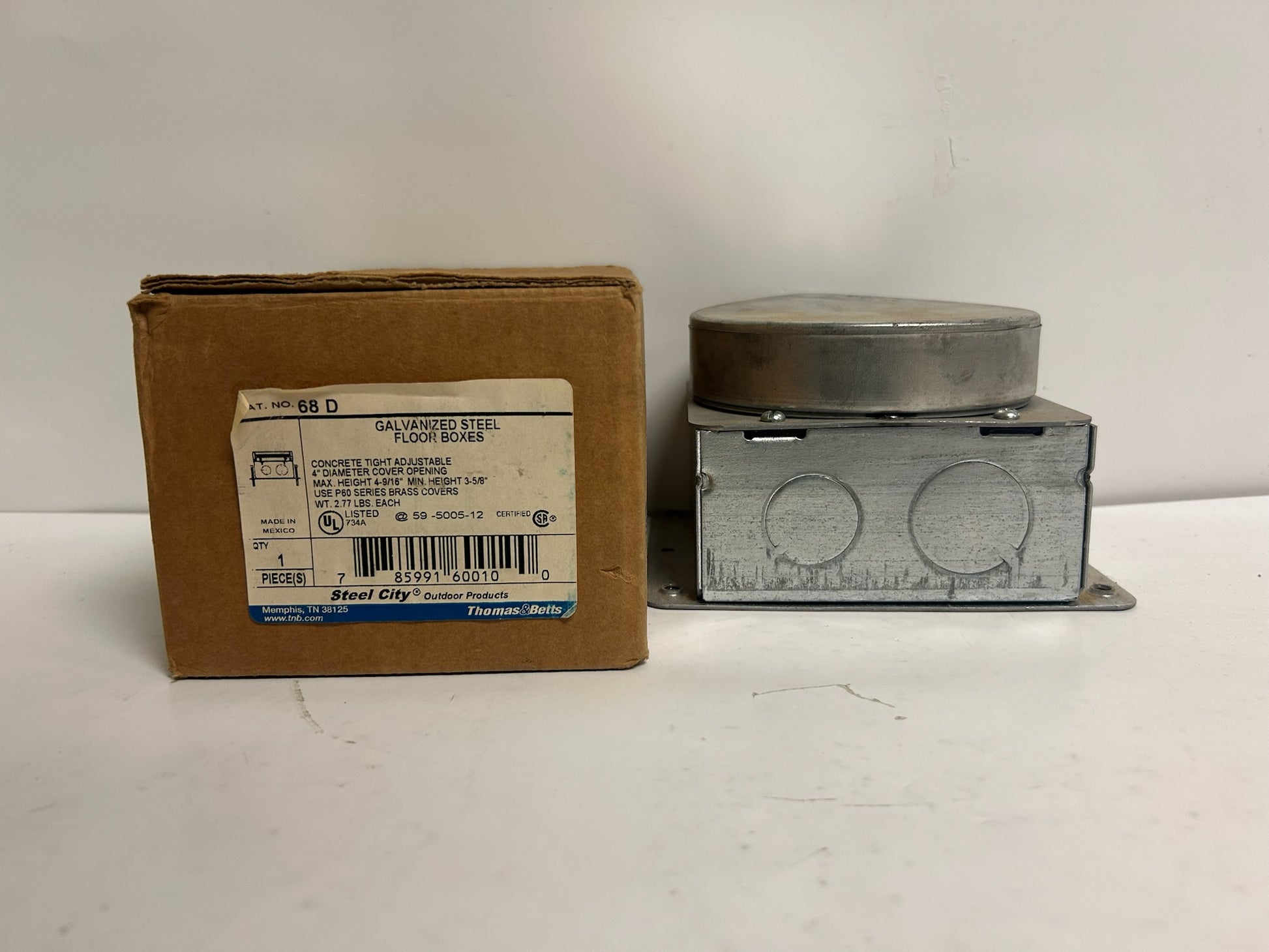 The Steel City 68D is a 1-gang, deep flush rectangular floor box designed for concrete-tight installations in commercial or industrial settings. Made of electro-galvanized stamped steel, it offers a 60 cubic inch capacity and includes 12 conduit knockouts for versatile wiring configurations. The box features both interior and exterior leveling screws, allowing up to 2½" adjustment before the concrete pour and ½" after the pour for precise flush alignment.