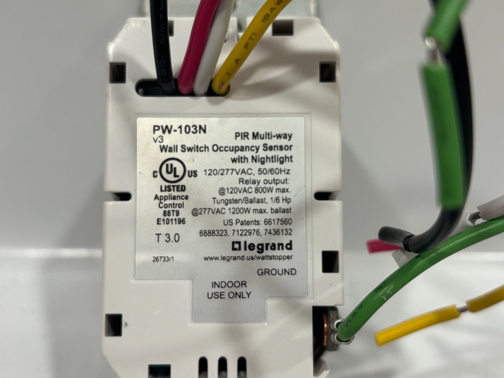 The Legrand PW-103N-W is a passive infrared (PIR) wall switch occupancy sensor designed to control lighting based on room occupancy. It features manual or automatic ON modes, a built-in nightlight, and multi-way switching capability. Ideal for energy-saving applications, it supports up to 800W at 120V and 1200W at 277V. The PW-103N-W has been discontinued and replaced by the RS-150BA-N-W.