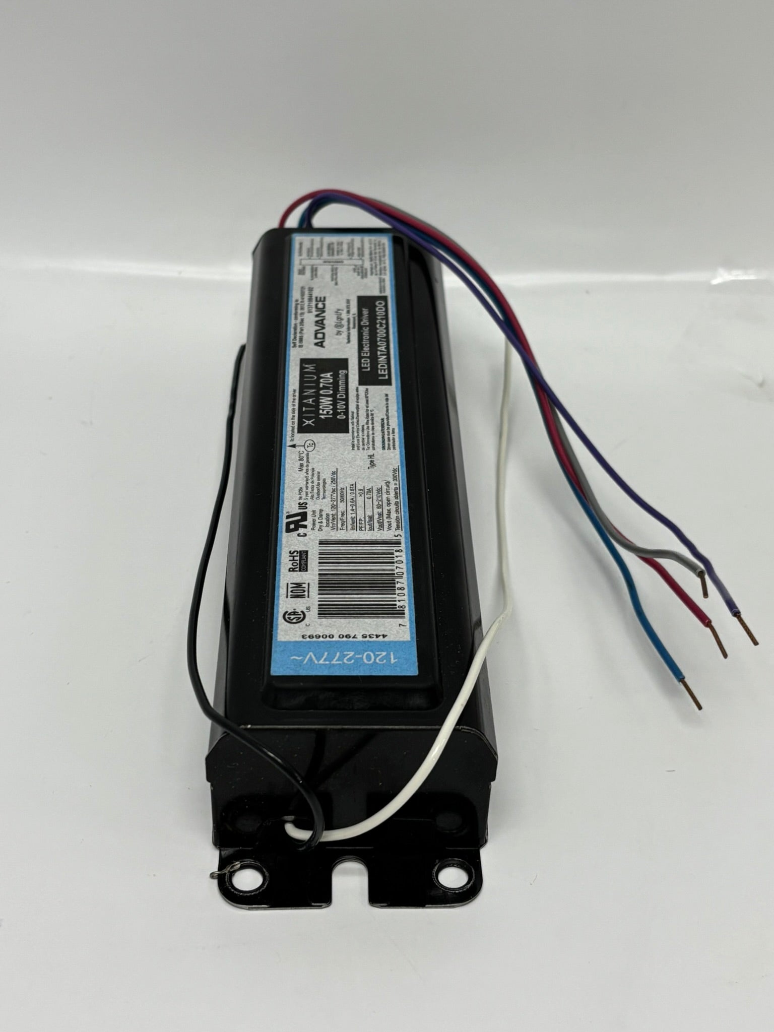 This is a 150 Watt LED Driver manufactured by Signify Advance. The input current is 120-277 volt and the output voltage range is 60-210 volt. The output current is set at 700mA and is not adjustable. The weather rating is UL Dry & Damp location rated.