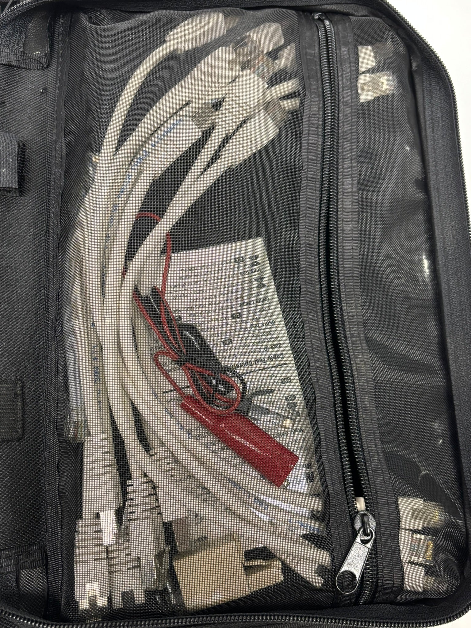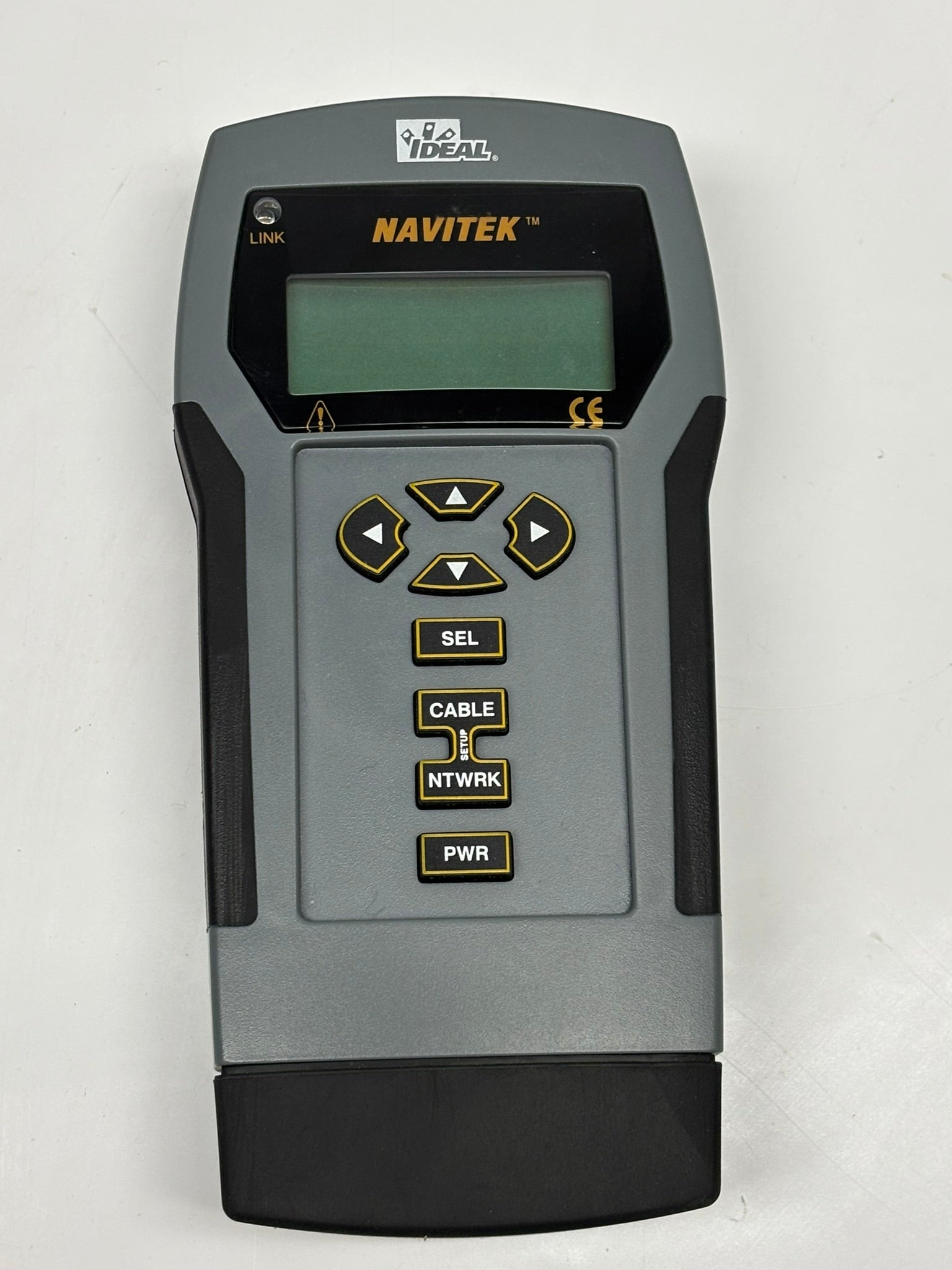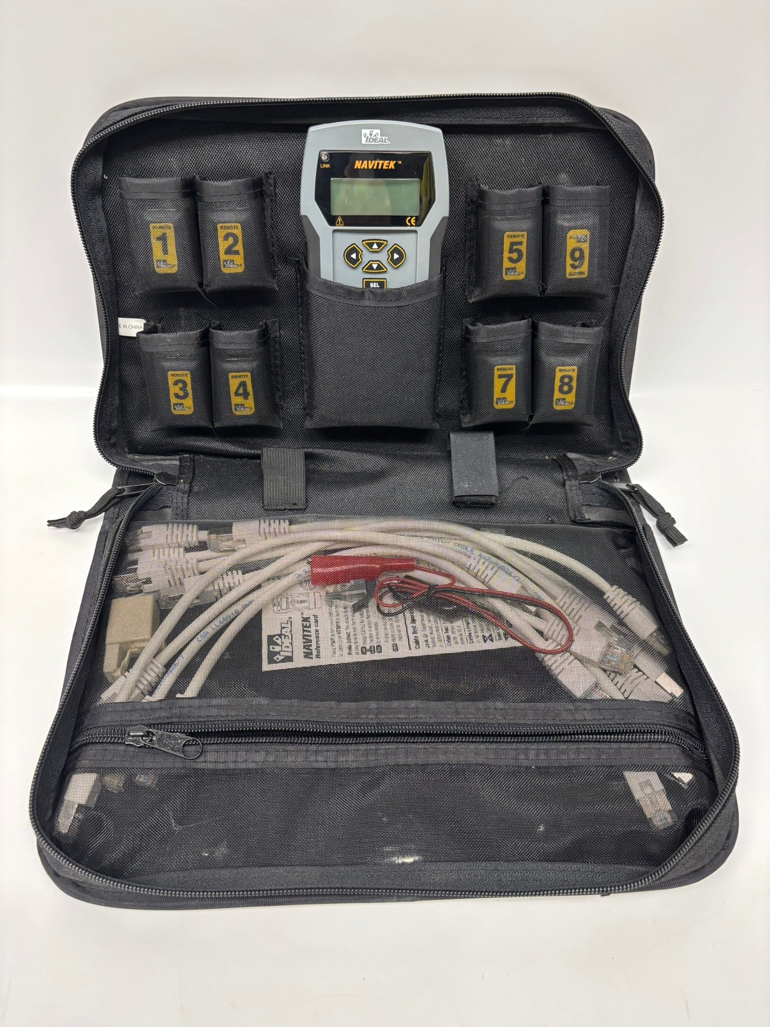 NAVITEK Network Tester with IP locating capabilities is used with 1 remote for CAT cable testing, 2 RJ45/RF male connectorsfor RG 59 cable & video camera testing 2 CAT5 Network cable testers 1 shielded 1 unshielded and 1 coax adapter with attached #1 remote for coax or video cable testing is used in good operational condition, back lighting compensation on PWR button for LCD display, at times some block letters on tester appear lighter than others carrier bag included.