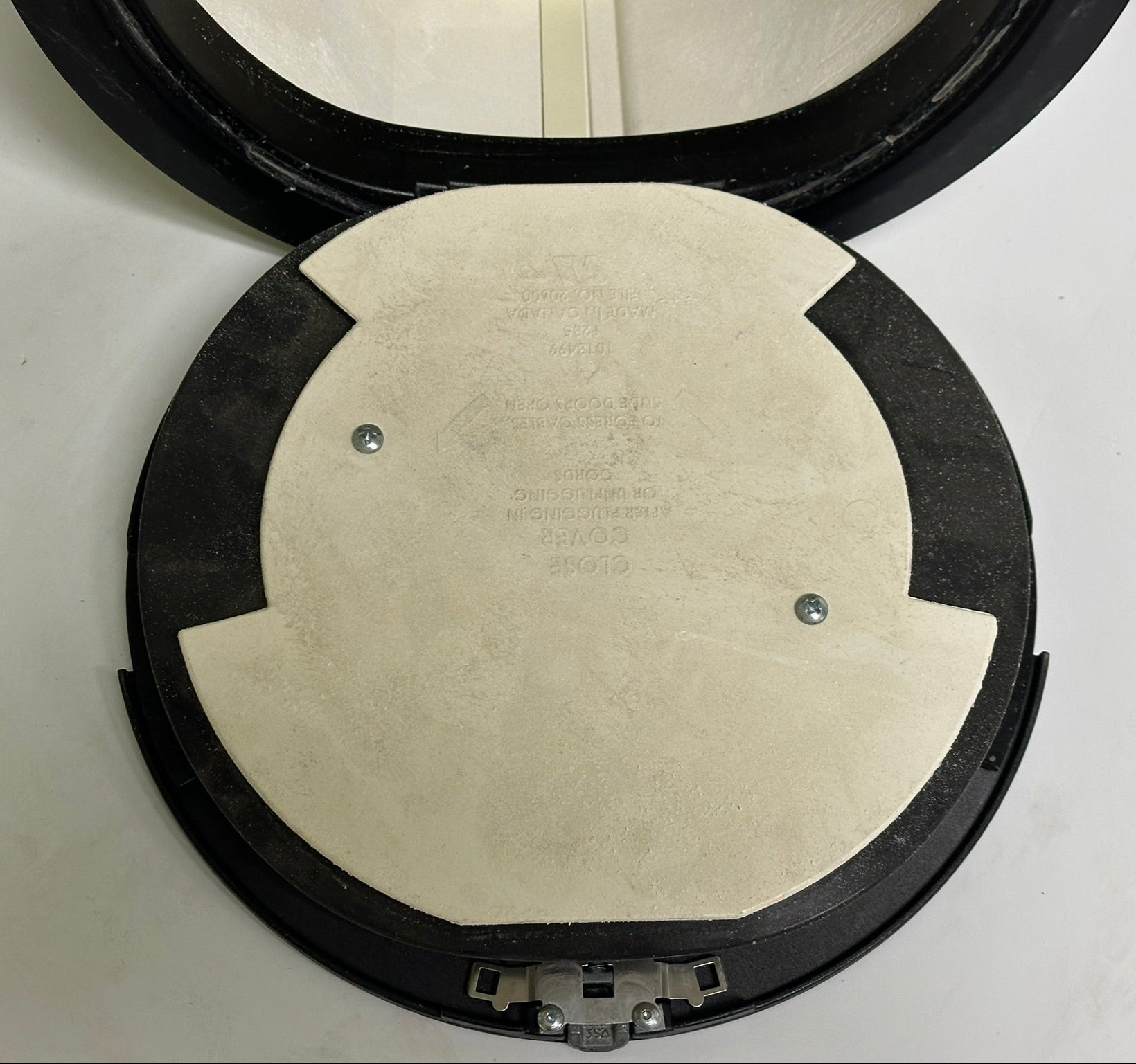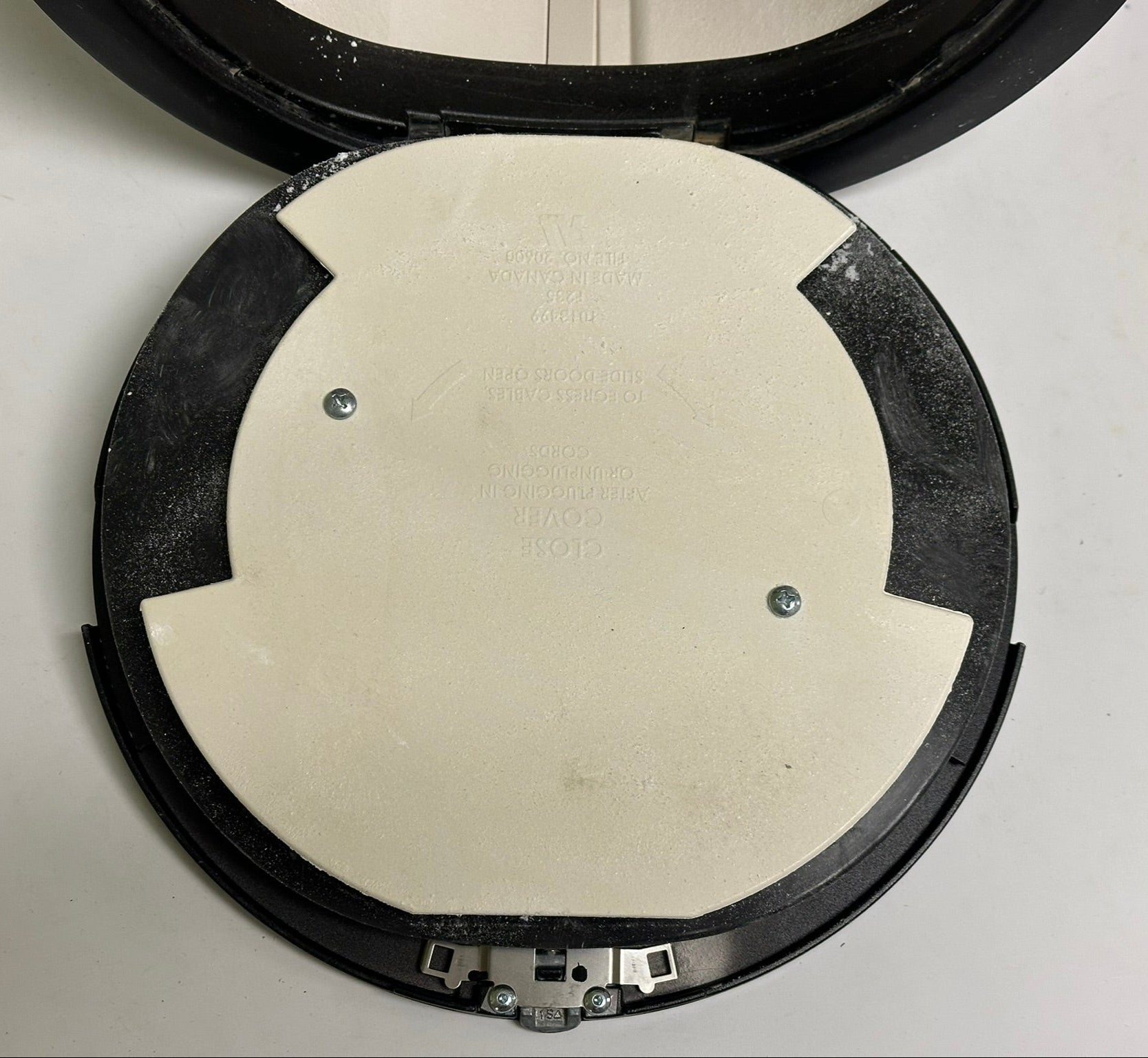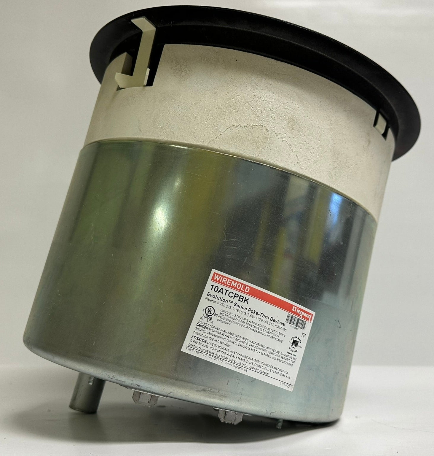 The WIREMOLD 10ATCPBK is a high-capacity, 10-inch Evolution Series poke-thru device designed for commercial spaces that require both power and data connectivity. This used unit is in good condition, featuring a sleek black cover that sits flush with finished floors for a clean, professional look. Prewired for easy installation, the 8-gang setup supports various configurations, making it perfect for offices, schools, and conference rooms. Built with fire-rated protection and durable materials, it offers reliable performance and safe cable access in high-traffic environments.